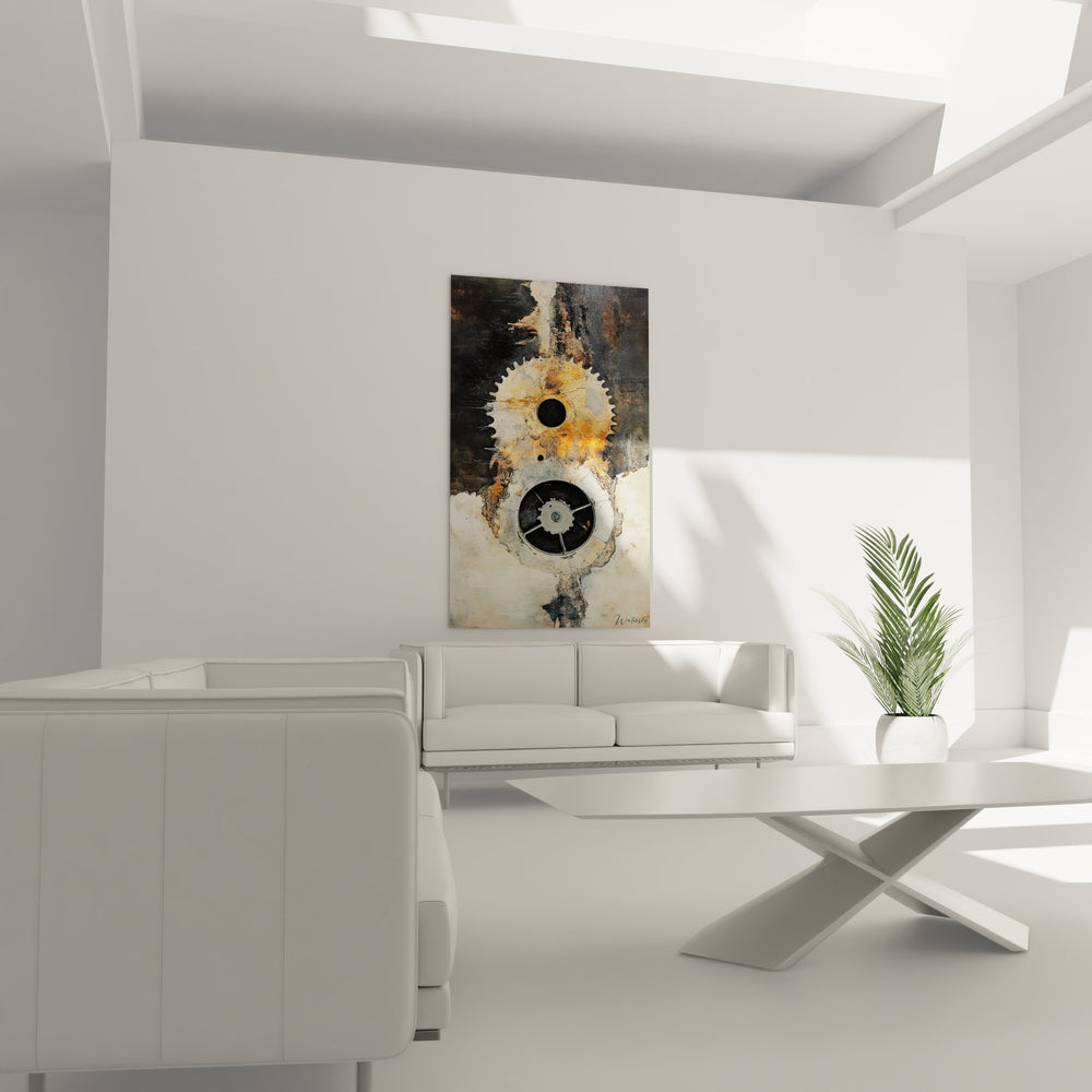 La palette chromatique de cette œuvre d'art engrenages oscille entre les tons ocre, rouille et gris métallique, créant une harmonie parfaite avec l'univers industriel. Les nuances dorées apportent une touche de chaleur contrastant avec la froideur du métal, symbolisant la rencontre entre l'humain et la machine. Cette peinture mécanisme industriel évoque le passage du temps et la beauté de l'obsolescence programmée.