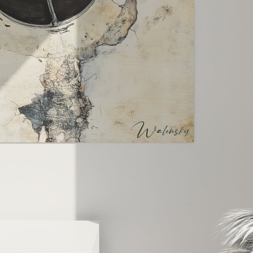 Ce tableau mural engrenages rouillés présente une composition artistique fascinante où les éléments mécaniques se mêlent à une esthétique industrielle vintage. L'œuvre met en scène deux engrenages métalliques positionnés de manière asymétrique sur un fond texturé aux nuances terreuses. Le premier mécanisme, situé dans la partie supérieure, révèle une roue dentée dorée partiellement oxydée, tandis que le second, plus bas, dévoile un système de pales métalliques complexe évoquant les rouages d'une ancienne machine industrielle. Cette décoration murale mécanisme vintage capture parfaitement l'essence de l'art steampunk moderne. Les détails minutieux des pièces mécaniques artistiques créent un dialogue visuel captivant entre fonctionnalité et esthétisme. L'artiste a magistralement intégré ces éléments dans une composition abstraite où la rouille et l'usure du temps racontent une histoire de transformation industrielle. Ce tableau art industriel moderne s'impose comme une pièce maîtresse pour tout amateur de déco murale style steampunk, offrant une réflexion artistique sur notre rapport aux machines et au temps qui passe.