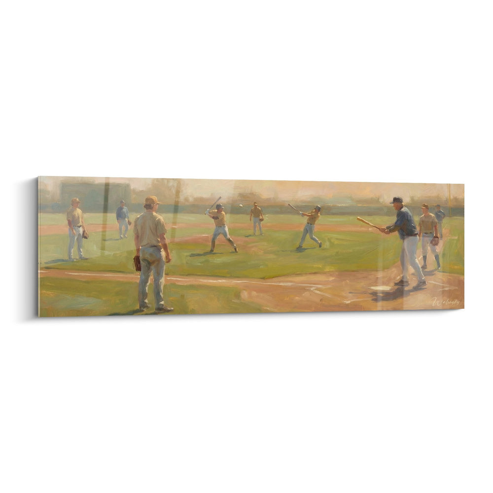 Les tons chauds dominent cette composition, avec des ocres, des beiges et des verts qui évoquent parfaitement l'ambiance dorée des fins d'après-midi sur les terrains de baseball. Cette palette chromatique crée une atmosphère nostalgique et chaleureuse, rappelant les grands moments du sport américain et l'esprit de camaraderie des équipes.