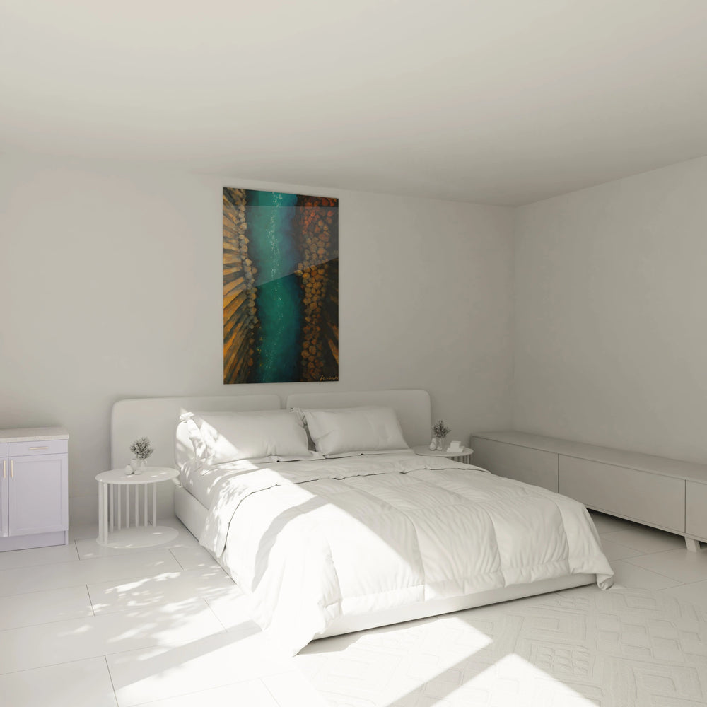Plus qu’une simple décoration, cette œuvre est le fruit d’une inspiration généreuse née d’une contemplation aérienne de rivières serpentinant à travers des canyons majestueux. Ce tableau capture avec élégance la dualité fascinante entre la douceur mouvante de l'eau et la solidité imposante de la roche. En découvrant chaque détail, vous ressentirez la fraîcheur vivifiante du turquoise contrastant avec les nuances ardentes des falaises orangées, mêlant intensité et sérénité.