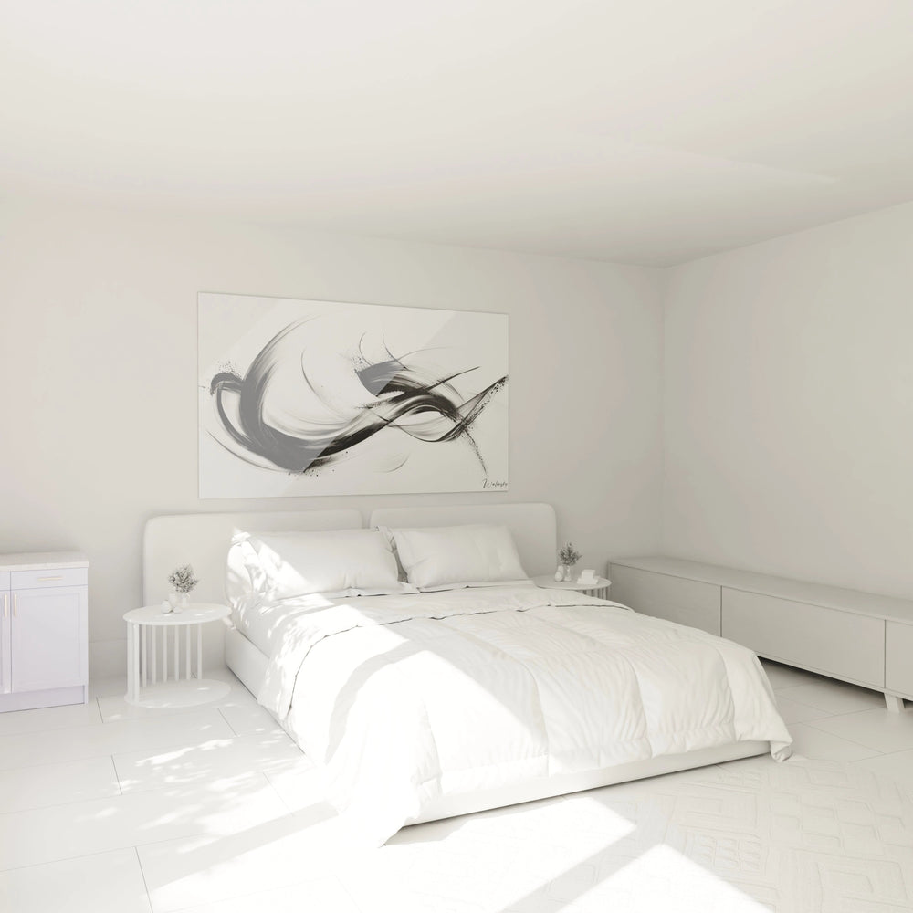 Façonné dans un style épuré et contemporain, ce tableau s’impose avec simplicité et élégance. La palette en noir, blanc et nuances de gris révèle toute l’authenticité de l’art abstrait, sublimant les courbes et les espaces par une profondeur remarquable. Sa texture nuancée amplifie ce jeu de lumière, faisant vibrer chaque détail au rythme d’un souffle vivant.