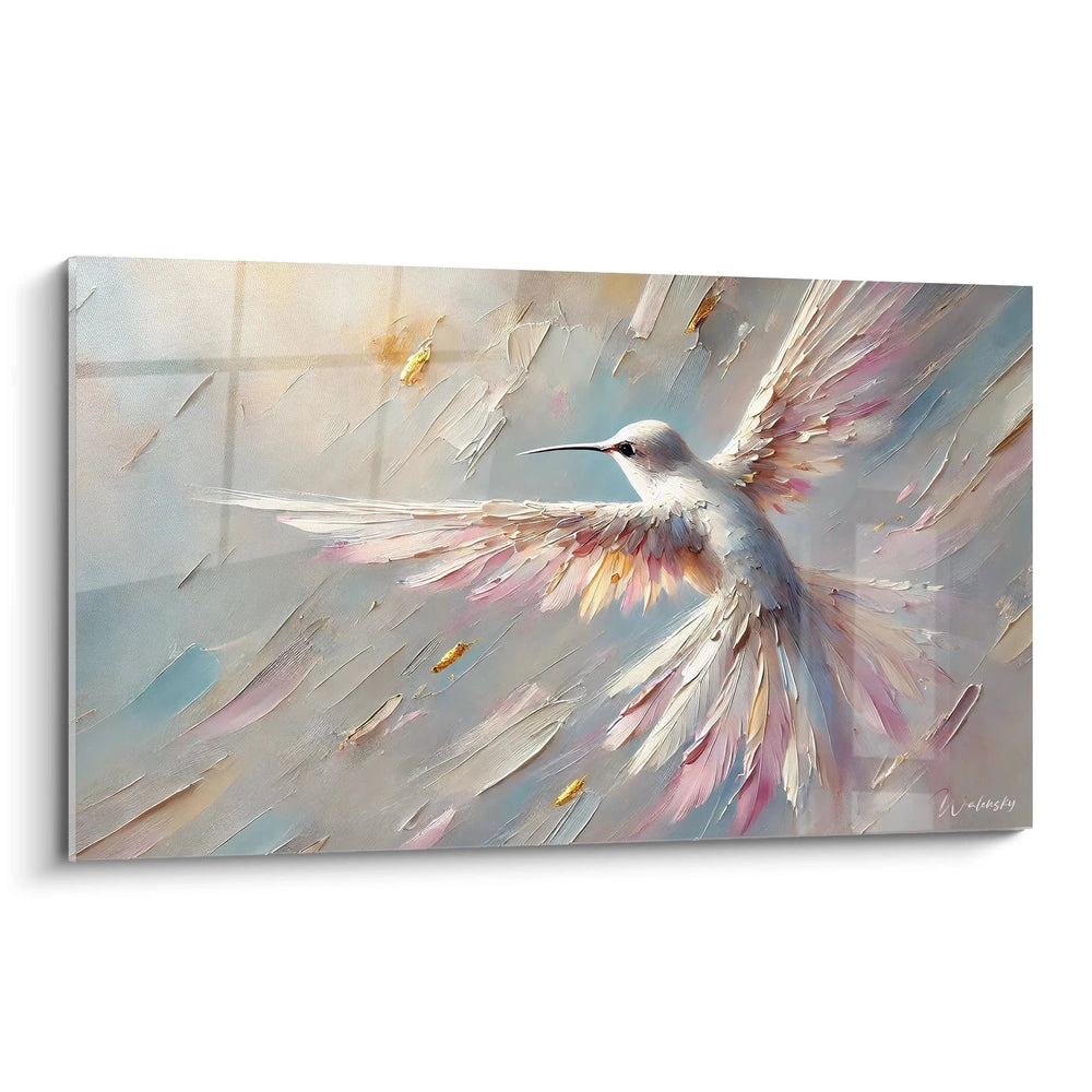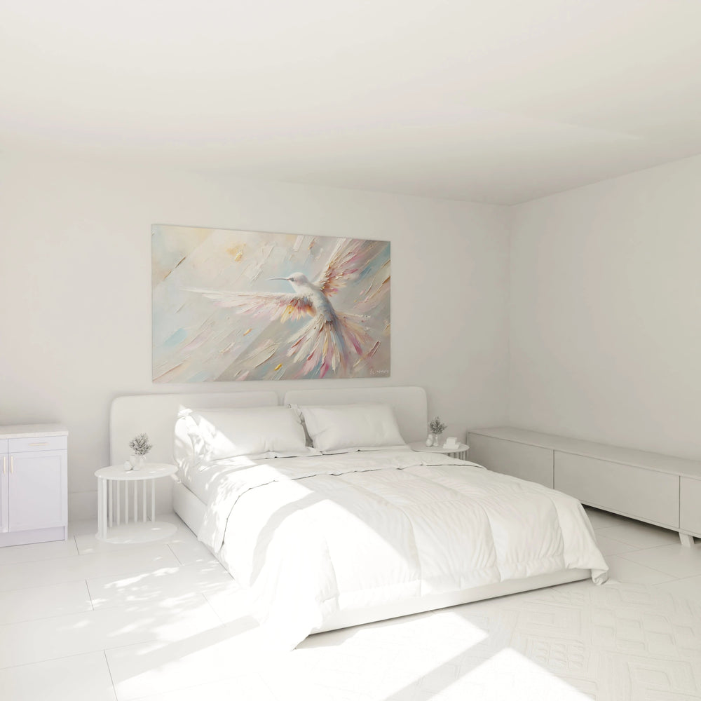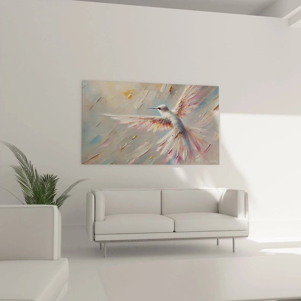 Ce tableau est bien plus qu’une simple décoration : il est une fenêtre ouverte sur un moment d’évasion, une rencontre magique avec la nature dans sa plus pure expression. Vous ressentez la délicatesse des ailes en mouvement, la caresse du vent, l’éclat léger qui sublime chaque plume. Il agit comme un souffle apaisant, invitant votre regard à s’évader, à ralentir et à savourer la beauté fugace, avant qu’elle ne se transforme en éternité.
