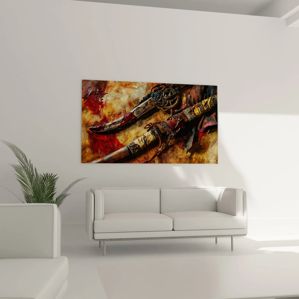 Ce tableau épée présente une arme d'apparat magnifiquement travaillée, aux détails dorés saisissants qui captent immédiatement l'attention. L'œuvre révèle une lame ensanglantée reposant dans un fourreau orné de motifs géométriques complexes, créant un contraste saisissant entre la brutalité et la beauté. Le tableau épée ancienne orientale se distingue par ses finitions métalliques qui semblent refléter la lumière de manière réaliste. Les gravures délicates sur la garde et le pommeau témoignent d'un savoir-faire artisanal exceptionnel, tandis que les traces rougeâtres sur la lame évoquent un passé guerrier intense.