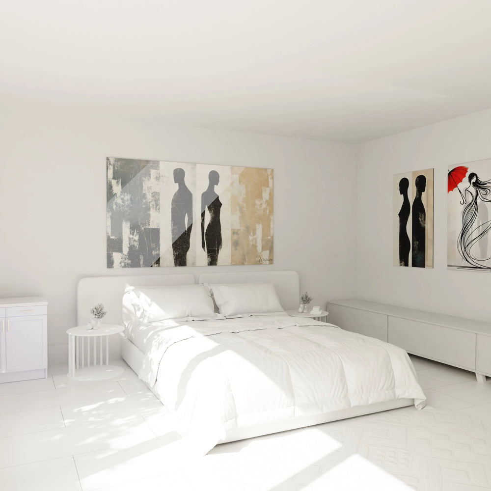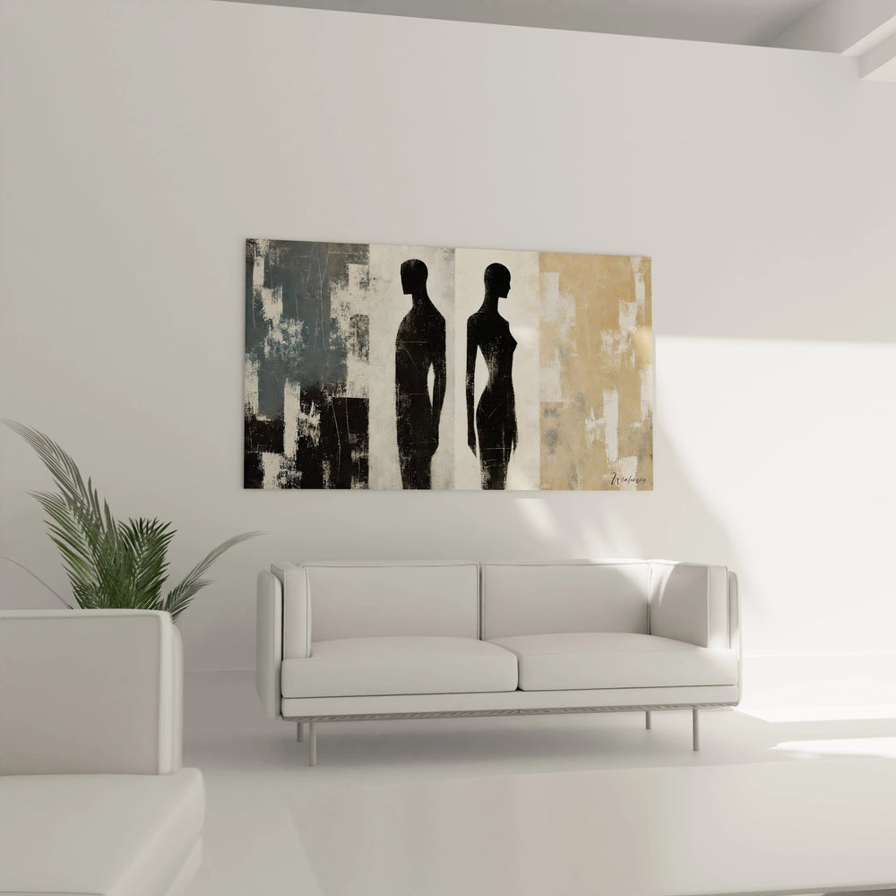 Ce tableau révèle la beauté mystérieuse des dualités qui nous animent : ombre et lumière, force et vulnérabilité, masculin et féminin. Chaque silhouette noire, posée avec précision sur un fond texturé aux tons gris et beige, semble s’extraire d’un rêve minimaliste pour nous rappeler combien l’équilibre naît de cette tension délicate entre contrastes.
