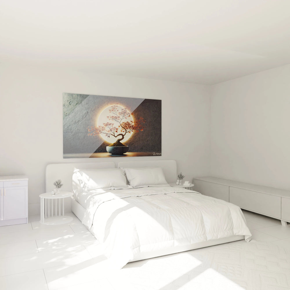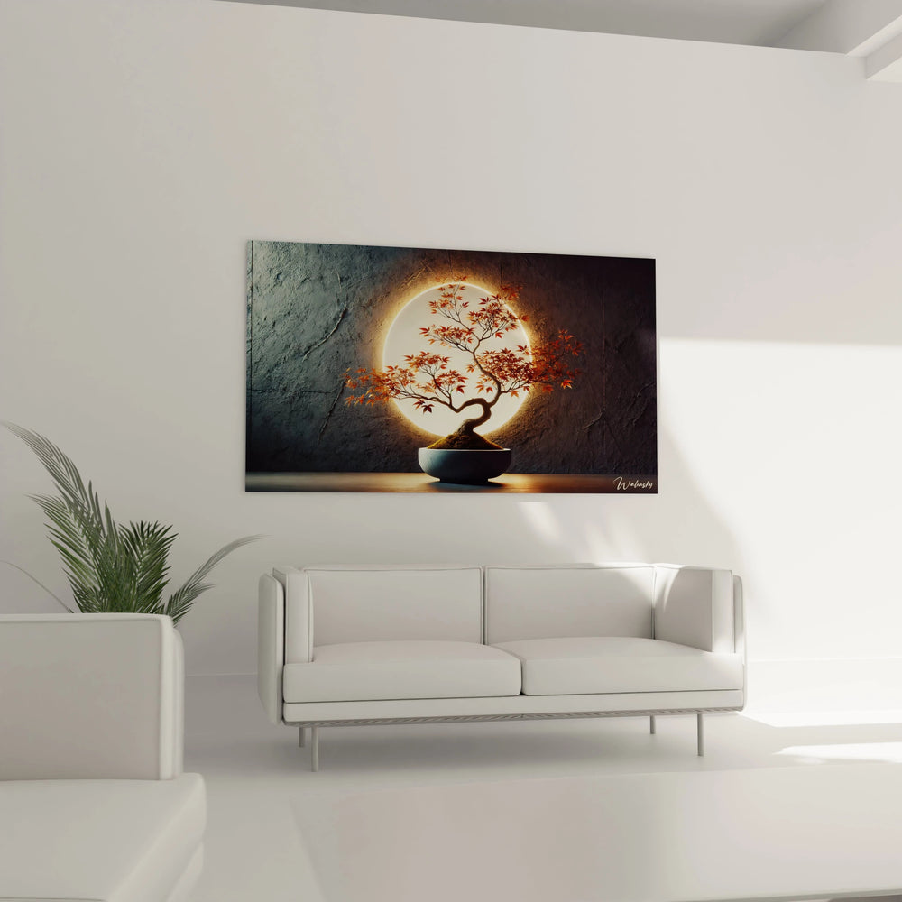 Ce tableau transporte l’essence d’un jardin zen, où chaque branche délicate du bonsaï semble danser sous un halo lumineux évoquant la lune, symbole ancestral de paix et d’équilibre. En déployant devant vous cette scène empreinte de douceur, il vous invite à vous évader, à ralentir et à ressentir pleinement la quiétude de l’instant présent.