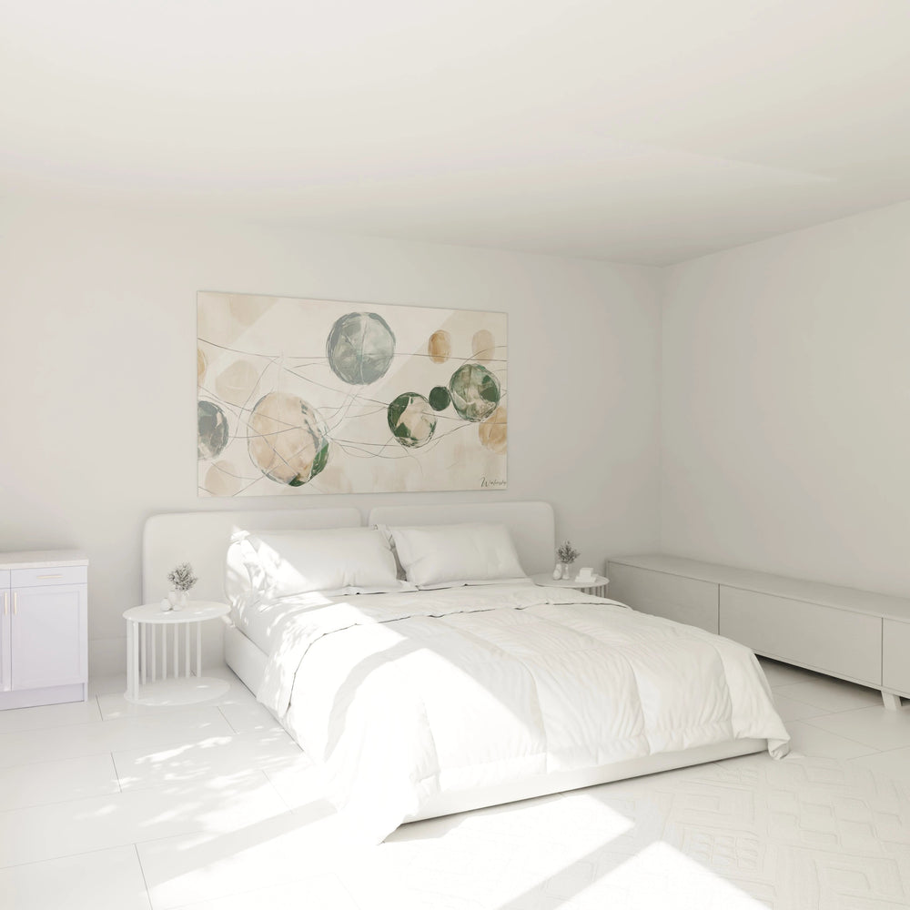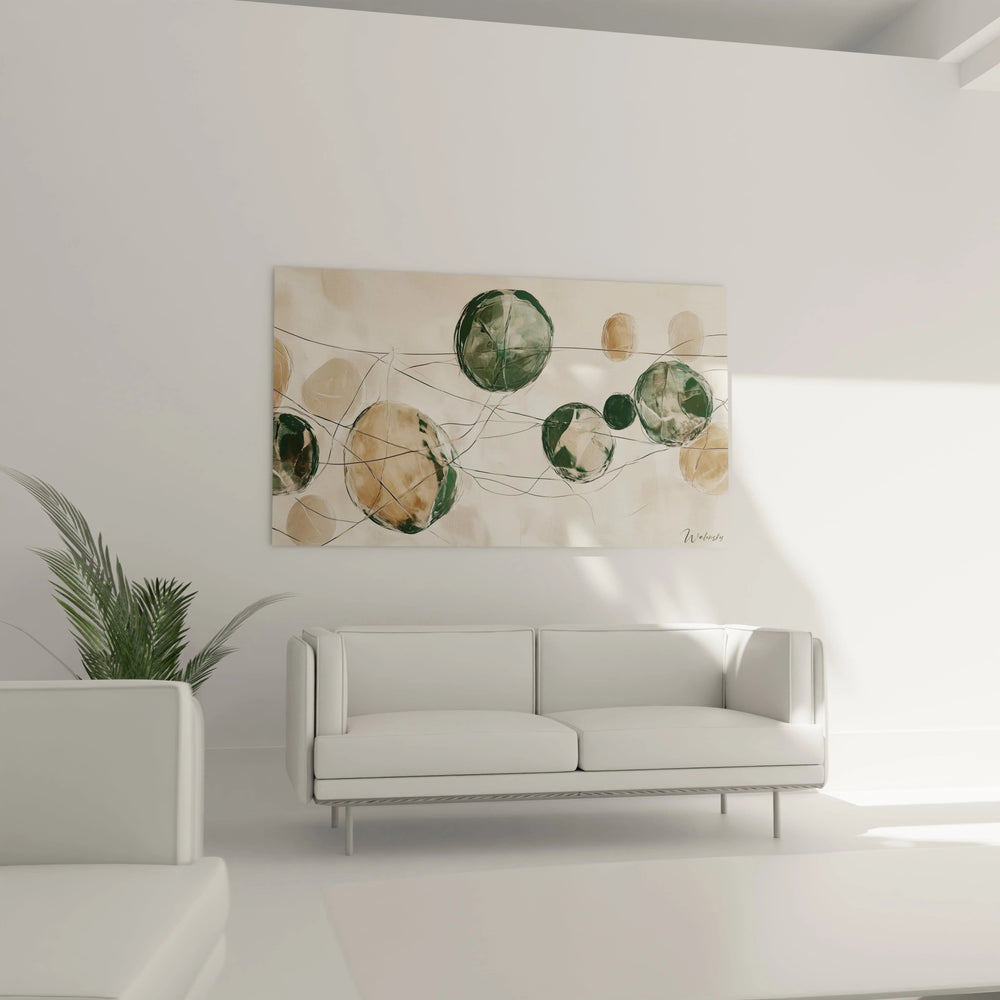 Ce tableau est bien plus qu’une simple décoration : c’est une composition inspirée par la nature elle-même, inspirée de feuilles virevoltantes dans le vent qui dessinent en douceur des chemins invisibles. Les formes organiques et circulaires se répondent dans une chorégraphie fluide, évoquant l’équilibre parfait entre dynamisme et tranquillité.