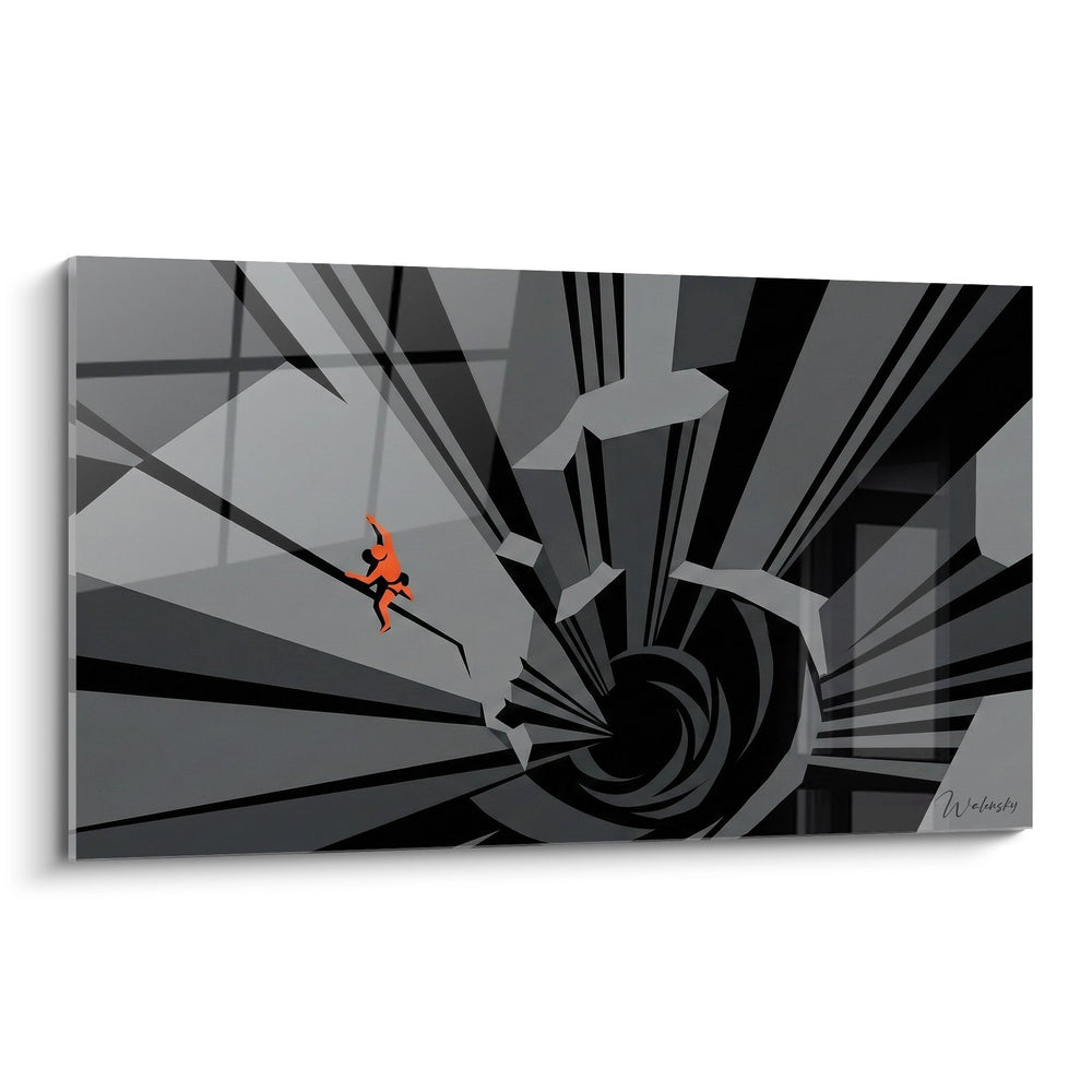 Ce tableau d'escalade abstraite présente une composition saisissante où un grimpeur en rouge évolue dans un univers géométrique complexe. L'œuvre combine habilement l'art contemporain et la passion de l'escalade, créant une perspective vertigineuse qui évoque les sensations intenses de la grimpe. Les formes angulaires et les lignes de fuite convergent vers un point central hypnotique, symbolisant l'engagement total du grimpeur dans son ascension. Cette représentation artistique de l'escalade transcende le sport pour devenir une métaphore visuelle de la persévérance et du dépassement de soi. Le contraste entre la silhouette humaine dynamique et l'environnement architectural abstrait crée une tension visuelle captivante, parfaite pour décorer un espace moderne ou une salle d'escalade.