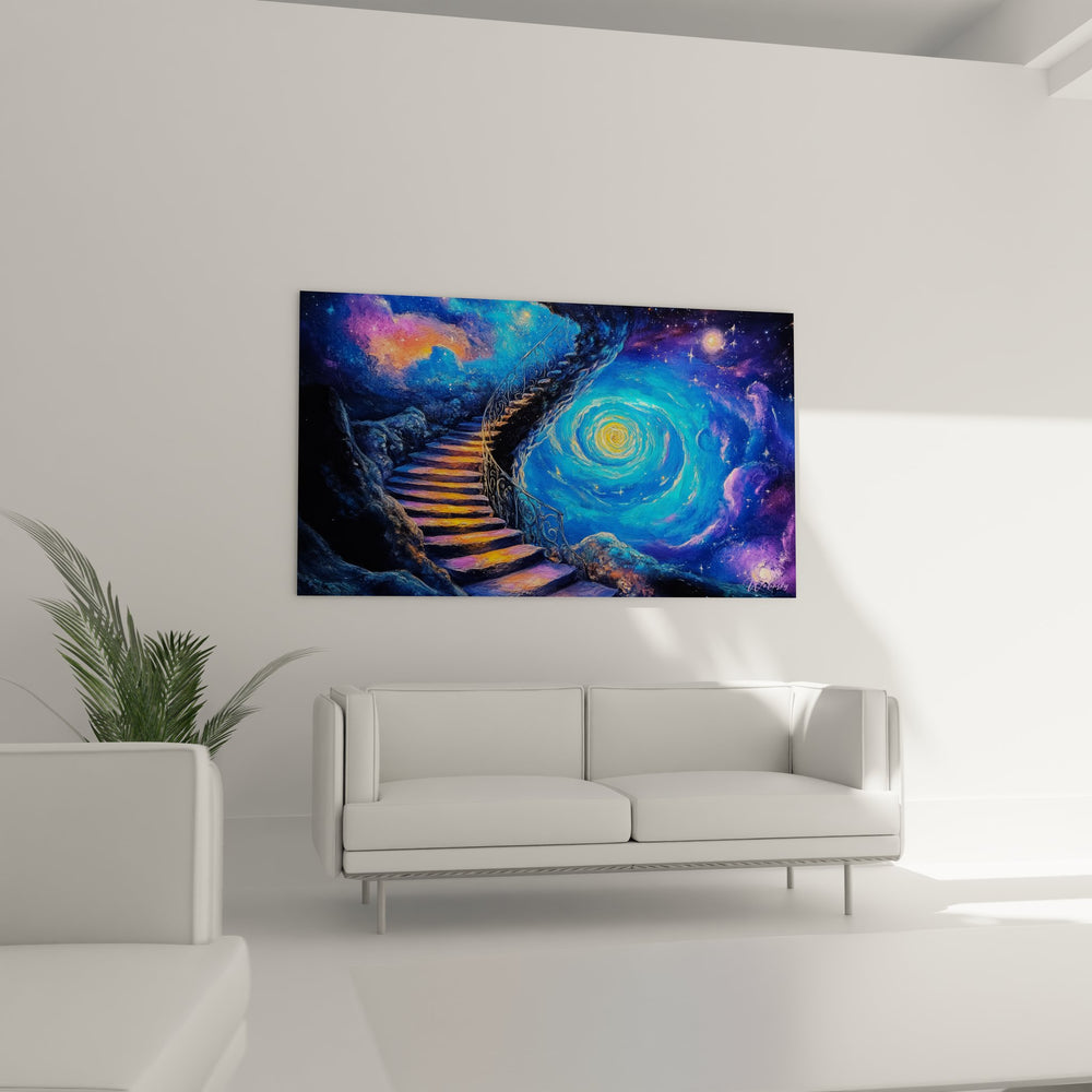 Tags : tableau escalier cosmique, spirale galactique bleue, art spatial abstrait, décoration murale étoiles, peinture ascension spirituelle