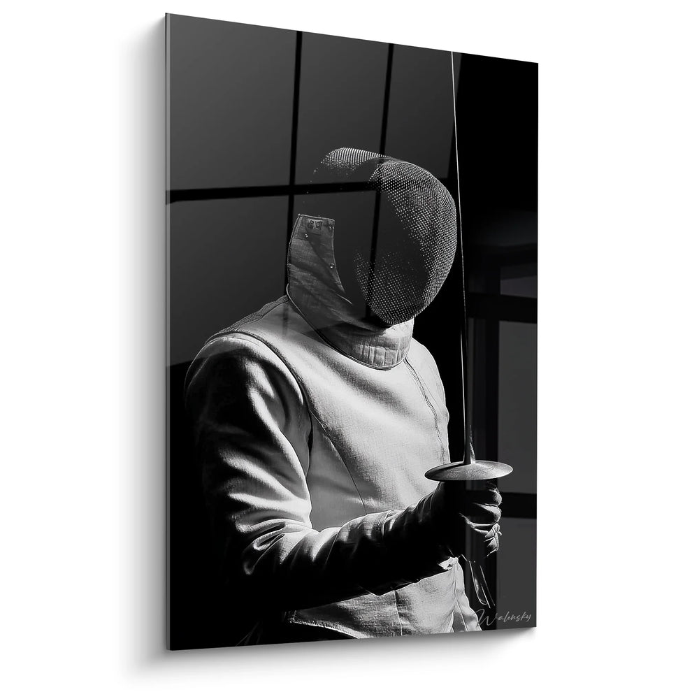 Tags: tableau escrime, art mural sport, décoration noir et blanc, portrait sportif, escrime artistique