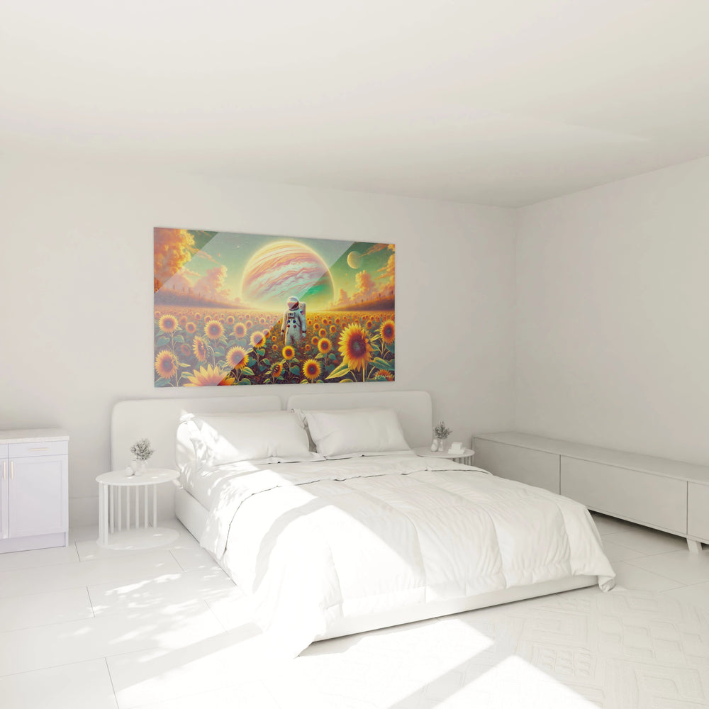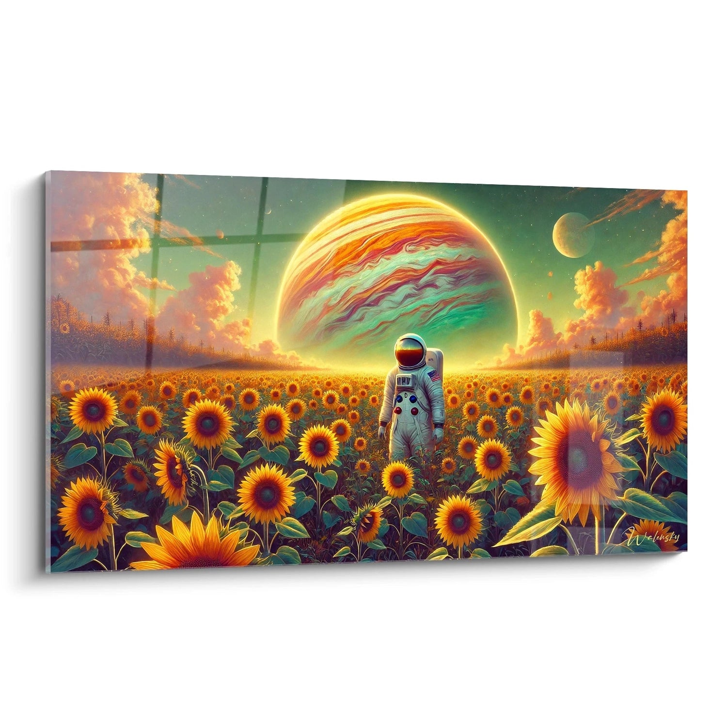 Cette création unique vous invite à ressentir la magie d’un instant suspendu : un astronaute, humble et curieux, déambulant dans ce décor onirique où tournesols éclatants côtoient la majesté cosmique. À travers cette juxtaposition saisissante, la toile évoque votre propre quête, vos aspirations à découvrir des horizons insoupçonnés tout en restant ancré dans la douceur et la lumière terrestre.