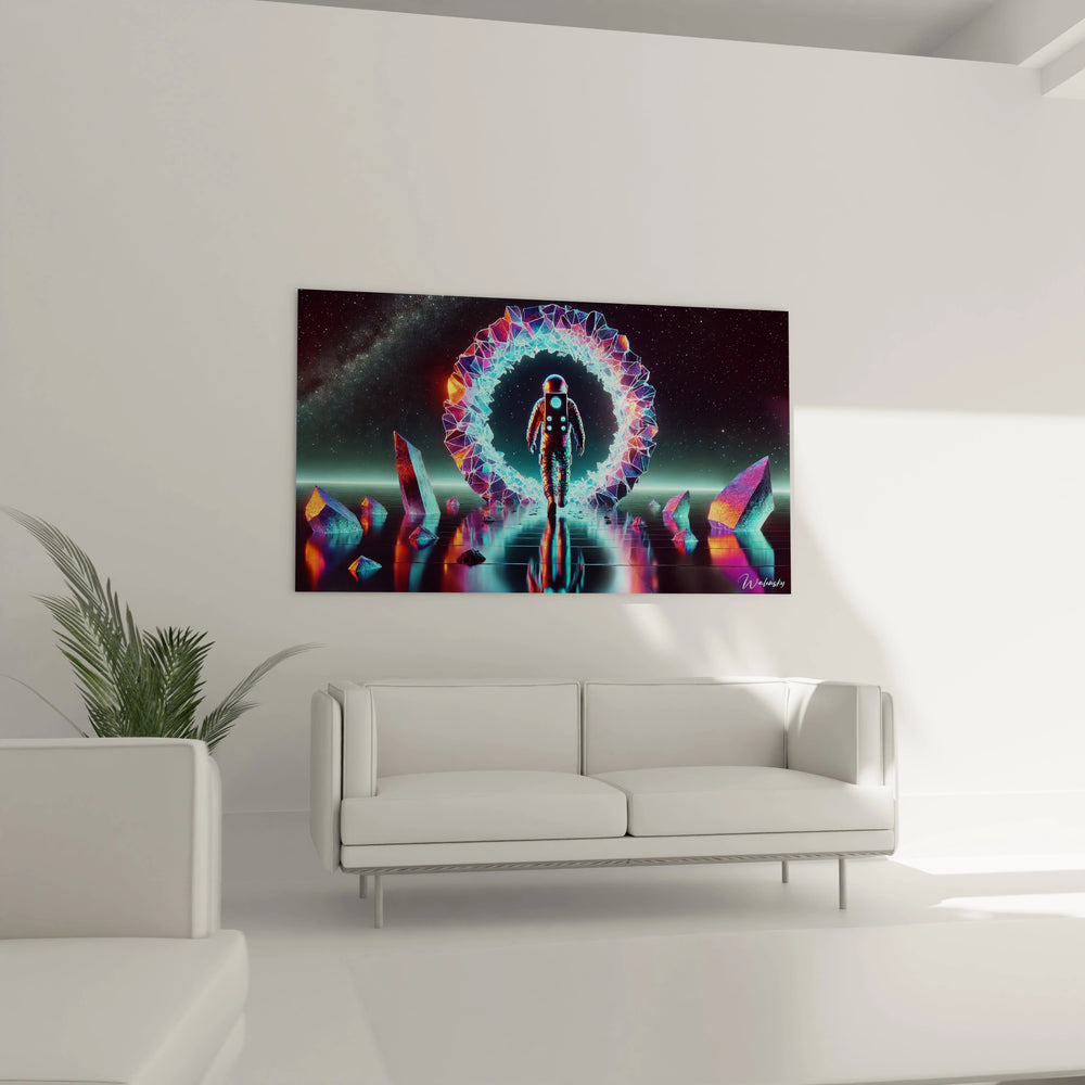 Imaginez un instant : un astronaute suspendu face à un portail lumineux, porte vers une autre dimension, baigné par des éclats de violet, d’orange incandescent et de bleu profond. Chaque détail semble vibrer d’une énergie cosmique, capturant l’essence même de l’espace et stimulant votre imagination à l’infini. Cette œuvre vous invite à un dialogue silencieux avec les étoiles, où chaque regard révèle un nouveau secret, une promesse d’évasion.