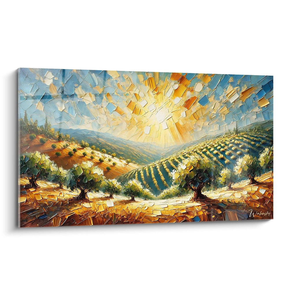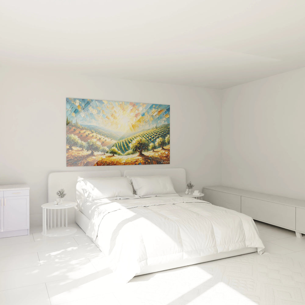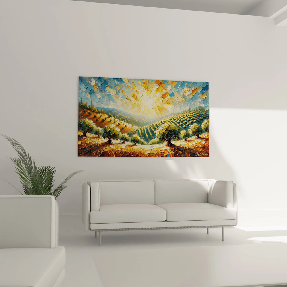 Chaque coup de pinceau évoque la palpitation de la campagne espagnole baignée de soleil. Vous pouvez presque sentir le parfum des oliveraies et entendre le murmure du vent caresser les feuilles. Les textures sculpturales et les touches vibrantes de jaune, vert et bleu donnent vie à ce paysage, laissant s’exprimer la beauté brute et intemporelle de la nature. Accrocher ce tableau, c’est inviter chez vous la majesté et la douceur des terres méditerranéennes, un souffle d’énergie apaisante et de lumière généreuse qui transforme chaque pièce.