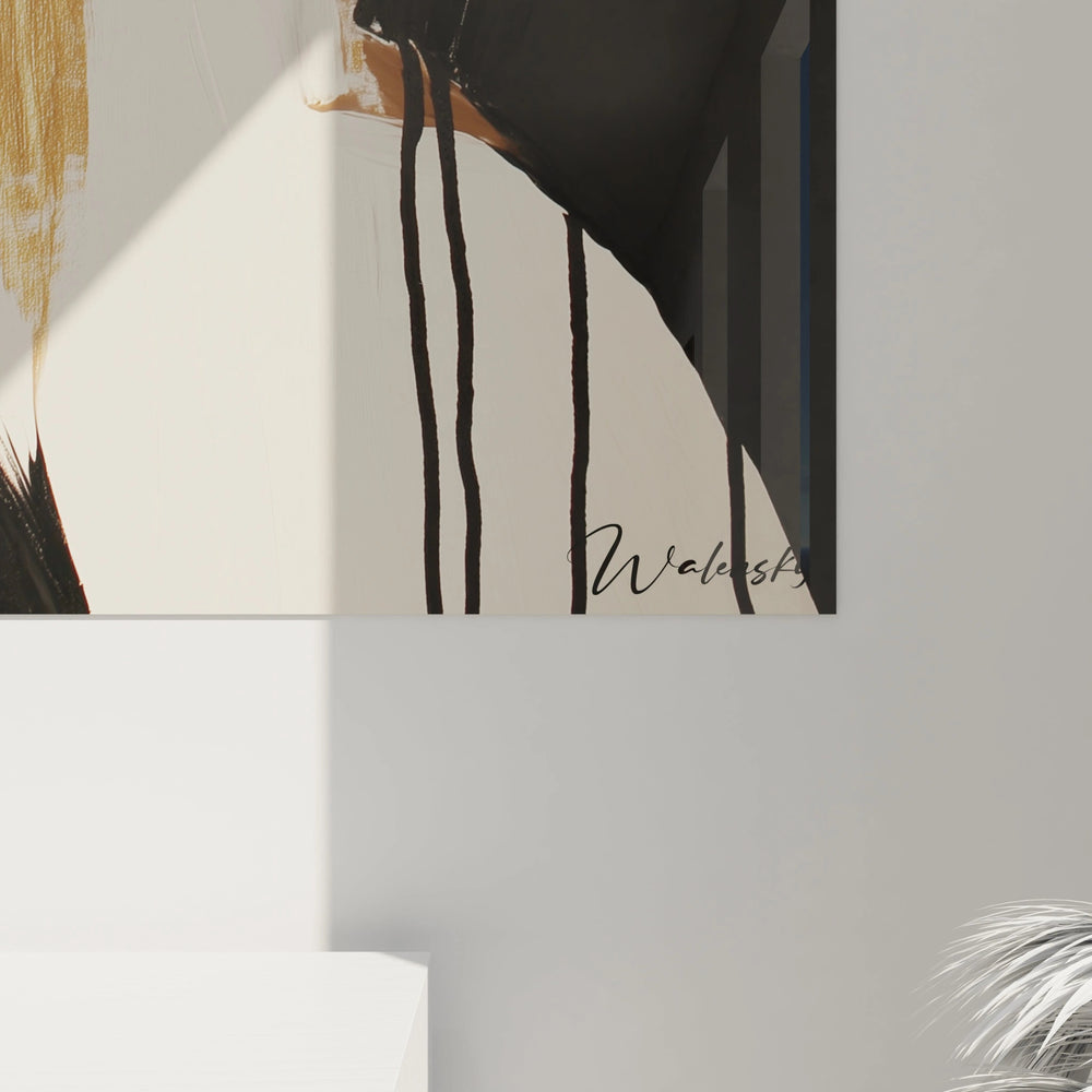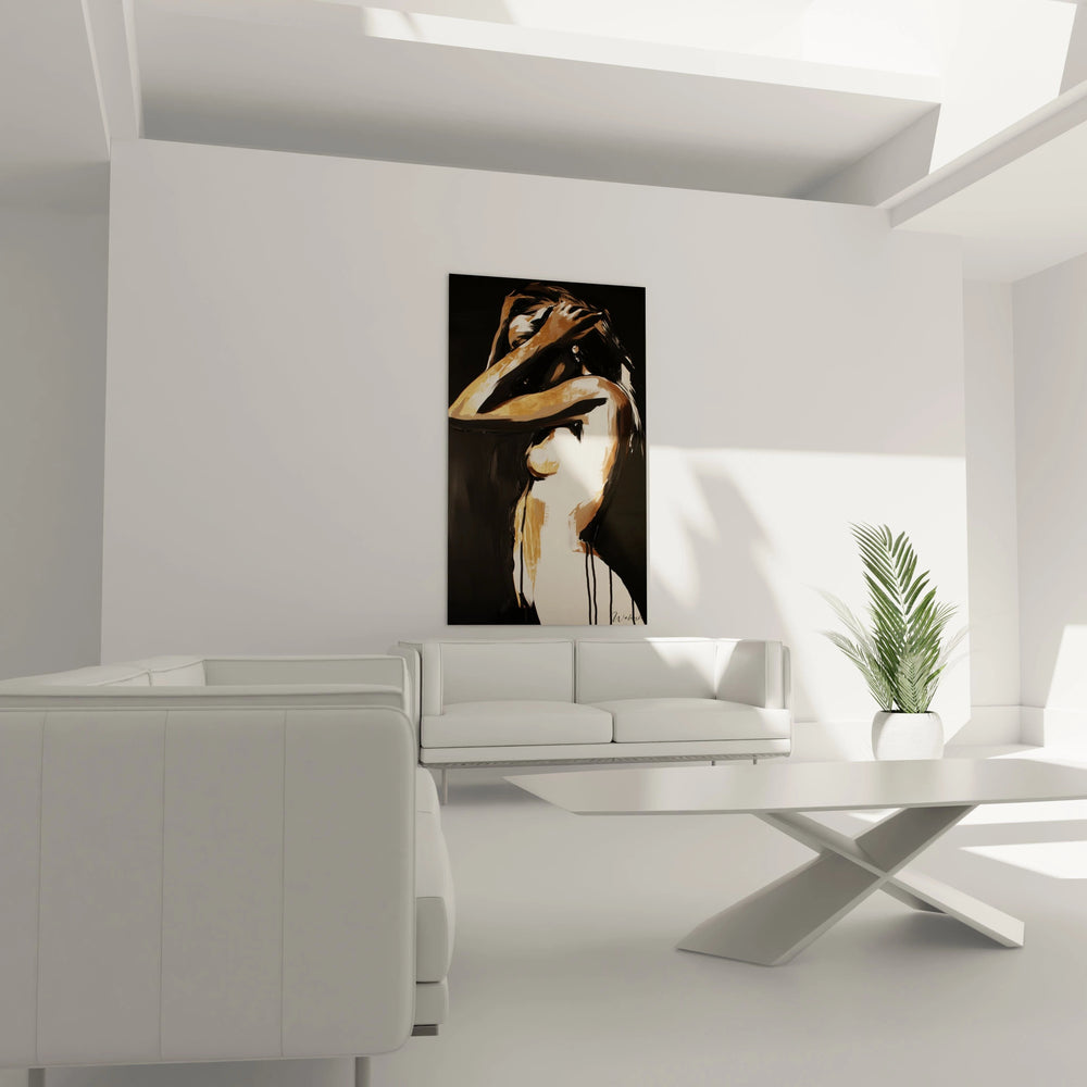 Chaque regard posé sur cette œuvre vous invite à plonger dans un univers où l’ombre et la lumière s’entrelacent en un ballet visuel fascinant. La silhouette féminine, sublimée par des nuances de noir profond et des accents dorés subtils, évoque une dualité puissante entre force intérieure et vulnérabilité assumée. Vous ressentirez une atmosphère douce et captivante – un équilibre singulier entre sérénité et intensité.