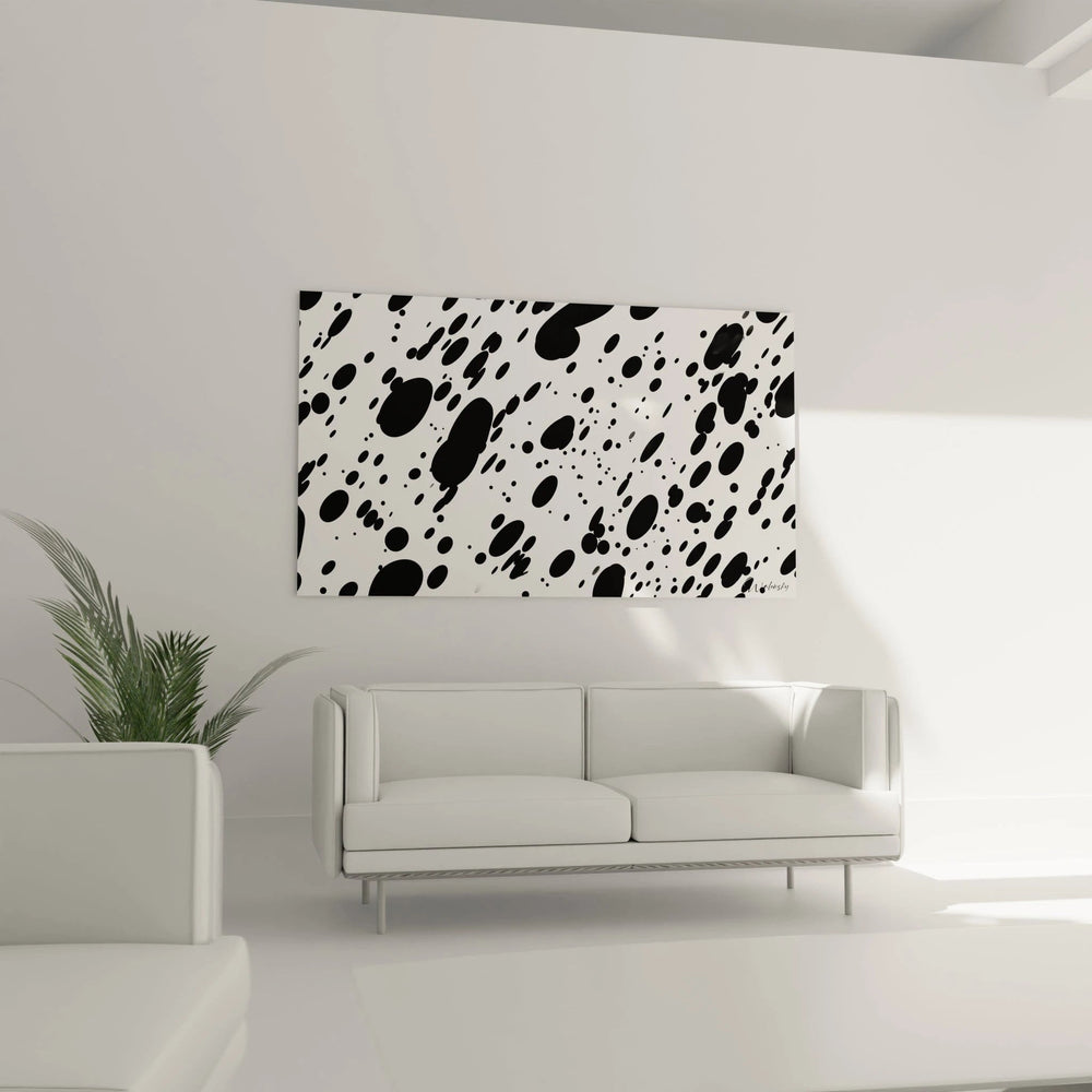 Ce tableau abstrait noir et blanc se distingue par sa composition dynamique de formes organiques dispersées sur un fond immaculé. Les taches de différentes tailles créent un rythme visuel captivant, alliant spontanéité et maîtrise artistique. Cette décoration murale abstraite présente un contraste saisissant qui attire immédiatement l'attention. Les formes fluides évoquent des gouttes de pluie figées dans le temps, créant une sensation de mouvement perpétuel. La signature discrète de l'artiste en bas à droite authentifie cette création unique. Cette œuvre contemporaine transforme l'espace par sa présence énergique et sa capacité à stimuler l'imagination.