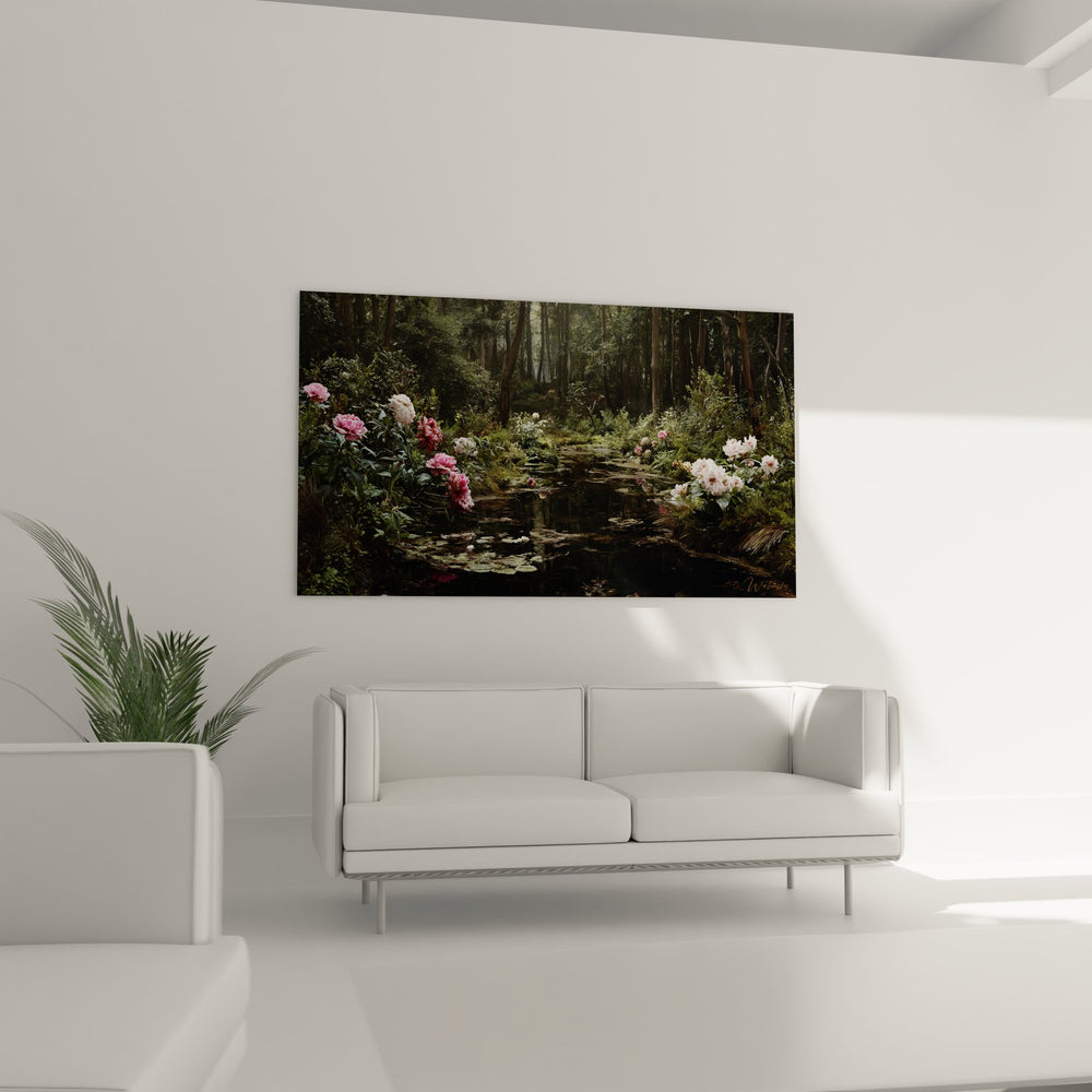 Transformez votre intérieur en un sanctuaire de paix et de beauté avec notre Tableau Étang aux Pivoines Forestier - Sérénité Florale - édition jungle. Ce chef-d'œuvre artistique est bien plus qu'une simple décoration murale ; il évoque un voyage sensoriel au cœur d'une nature luxuriante, où l'élégance des pivoines rencontre la quiétude des étangs.