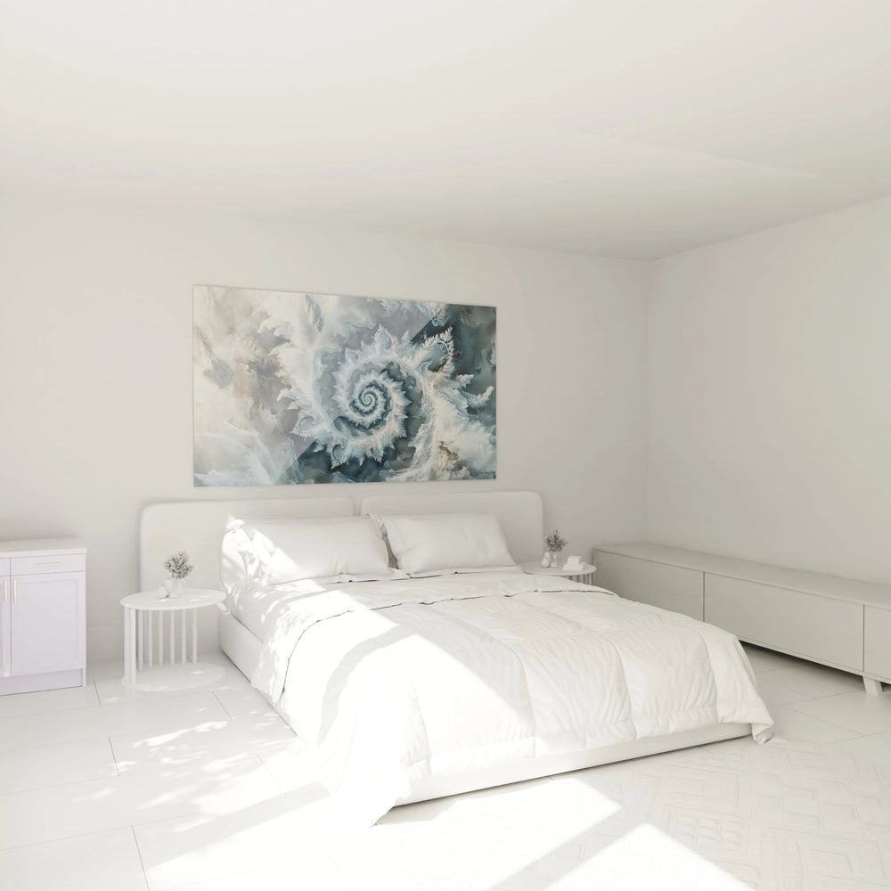 Plongez dans une atmosphère où le souffle frais d’un vent polaire se mêle à des nuances cristallines et apaisantes. Ce tableau capte le mouvement fluide et éternel d’une spirale abstraite, évoquant le balancement harmonieux des galaxies et les tracés mystérieux de la nature. L’intensité des bleus glaciaux, la pureté du blanc éclatant et la profondeur subtile des gris se rencontrent pour créer un tableau d’une élégance rare, qui habille votre mur d’une aura à la fois froide et rassurante.