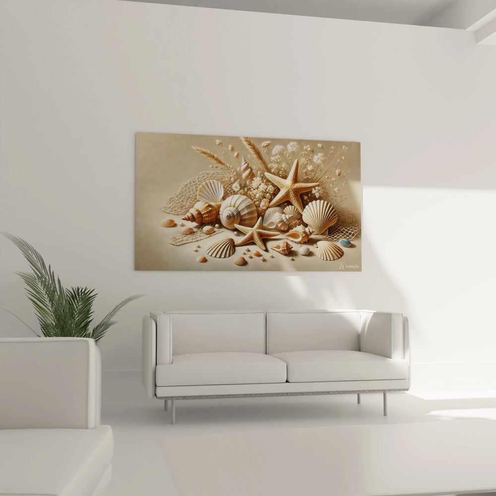 Ce tableau ravit par sa composition harmonieuse et authentique, où la délicatesse des coquillages, des étoiles de mer et des fleurs séchées se mêle en une symphonie de teintes beige, or et blanc. Cette palette tout en douceur évoque l’intemporalité des plages baignées de soleil, offrant une atmosphère apaisante et chaleureuse à votre intérieur.