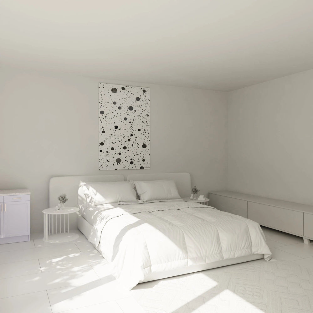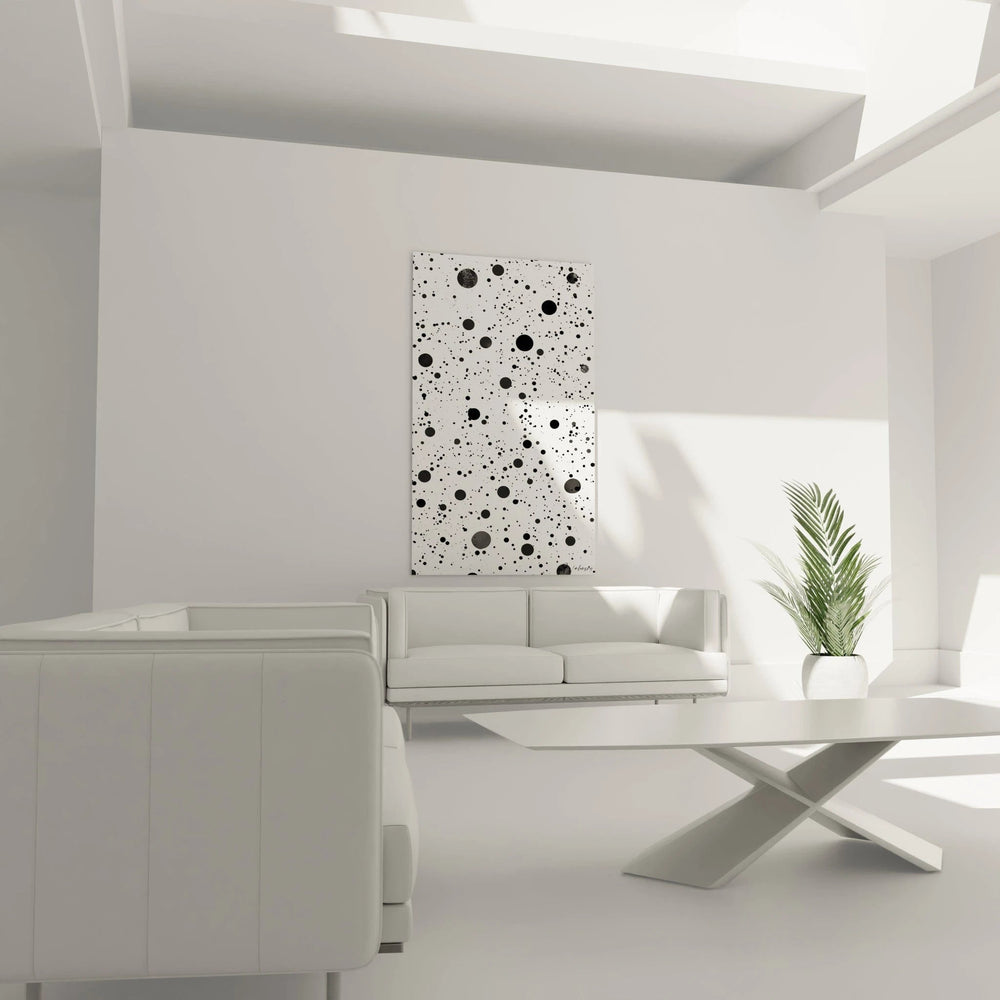 Ce tableau abstrait points présente une composition fascinante de cercles noirs de différentes tailles dispersés sur un fond blanc immaculé. Cette décoration murale moderne minimaliste capture immédiatement l'attention par son contraste saisissant et sa distribution organique des éléments. Le tableau points dispersés aléatoirement évoque un sentiment de liberté créative et de spontanéité artistique. Les points varient considérablement en dimensions, créant une hiérarchie visuelle naturelle qui guide le regard à travers l'œuvre. Cette art mural contemporain géométrique démonte parfaitement l'efficacité du noir et blanc dans l'art moderne.