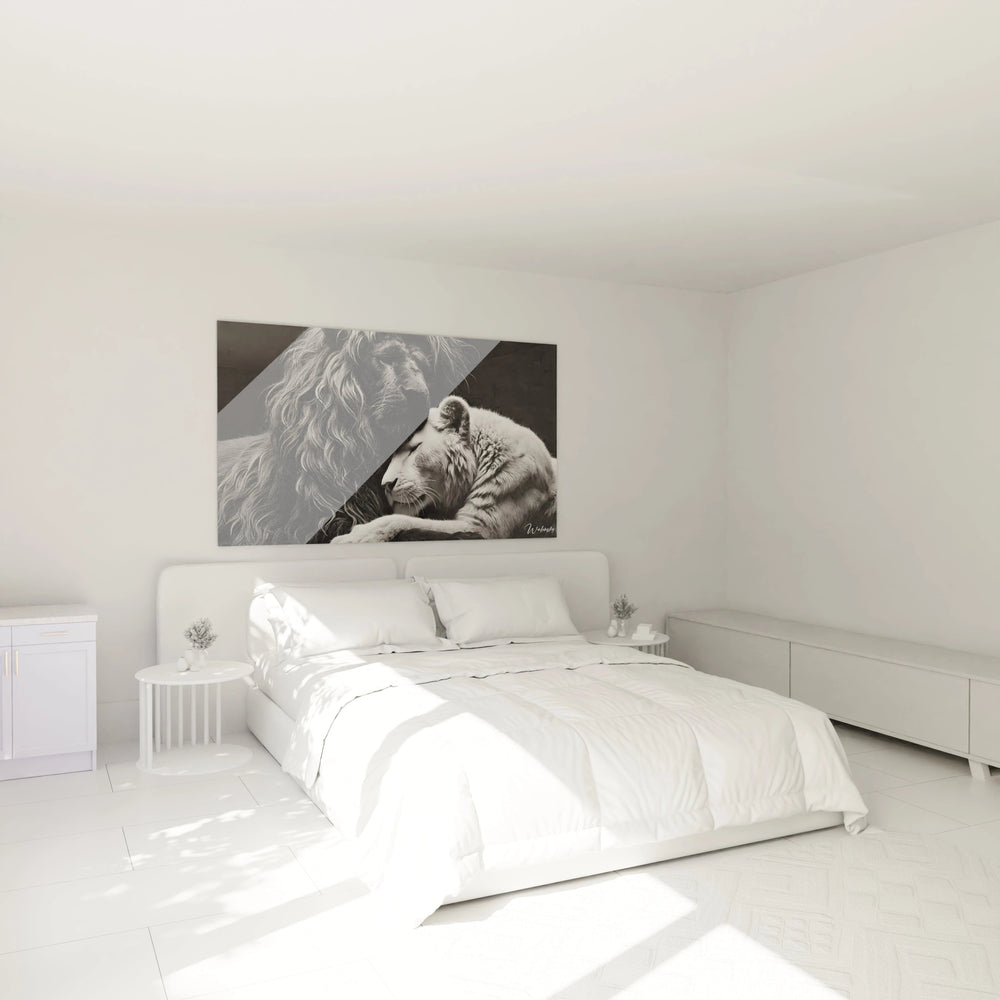 À travers ce chef-d'œuvre monochrome, vous ressentez la puissance tranquille d’un geste simple : une étreinte. Cette scène intime témoigne d’une confiance totale, d’une protection réciproque et d’un amour silencieux, loin des rugissements et du tumulte de la savane. La complicité entre ces deux félins évoque la beauté d’une connexion authentique, essentielle même pour les plus grands rois de la nature.