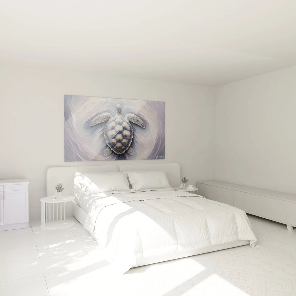 Imaginez la caresse légère des vagues sur une journée tranquille, la lumière douce jouant sur les courbes délicates d’une tortue glissant paisiblement. Cette œuvre capte cet instant suspendu, vous offrant une présence calme qui apaise l’esprit et invite à ralentir. Chaque regard porté sur ce tableau transforme votre espace en un sanctuaire de paix, où règnent équilibre et douceur.