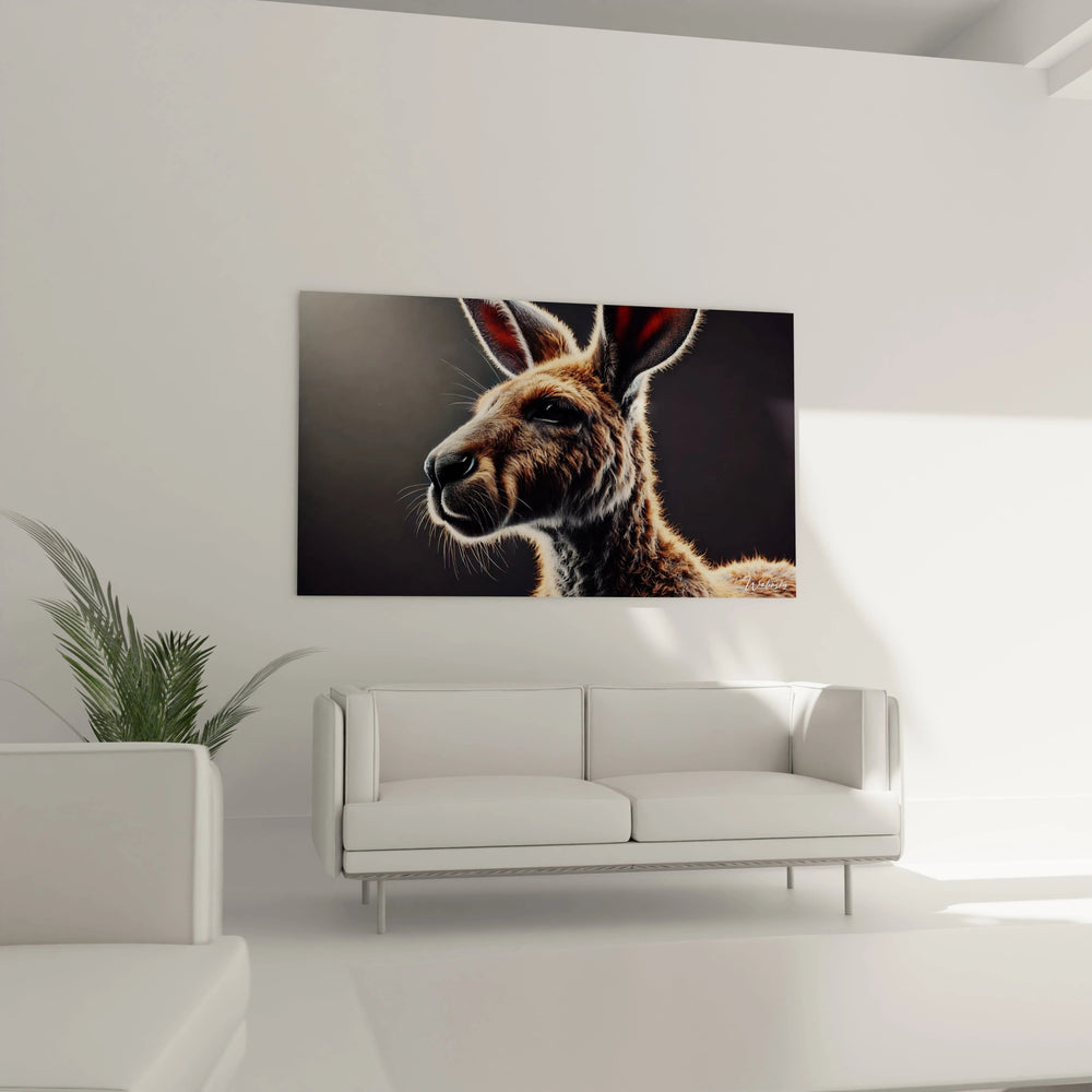 Ce tableau révèle plus qu’un simple animal : il offre un regard empreint de sagesse et de douceur, une invitation à la contemplation. Chaque détail accentué, des nuances chaudes de marron aux ombres profondes, crée un contraste saisissant qui donne vie à la scène, comme si le kangourou émergeait d’une clairière baignée d’une lumière tamisée. En le contemplant, vous ressentez une calme assurance, une force intérieure qui apaise et inspire.