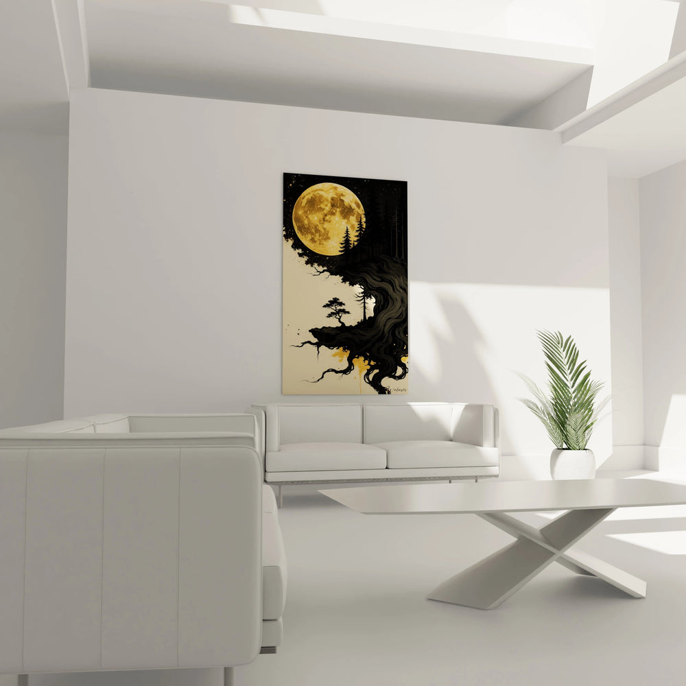 La nature sauvage nippone, symbolisée par un pin solitaire et la délicatesse d’un bonsaï, s’exprime dans des lignes fluides et organiques, tandis que la rondeur parfaite de la lune dorée impose un équilibre visuel apaisant. Ce dialogue subtil entre tradition et modernité vous permettra de ressentir pleinement cette harmonie rare, comme suspendue dans le temps.