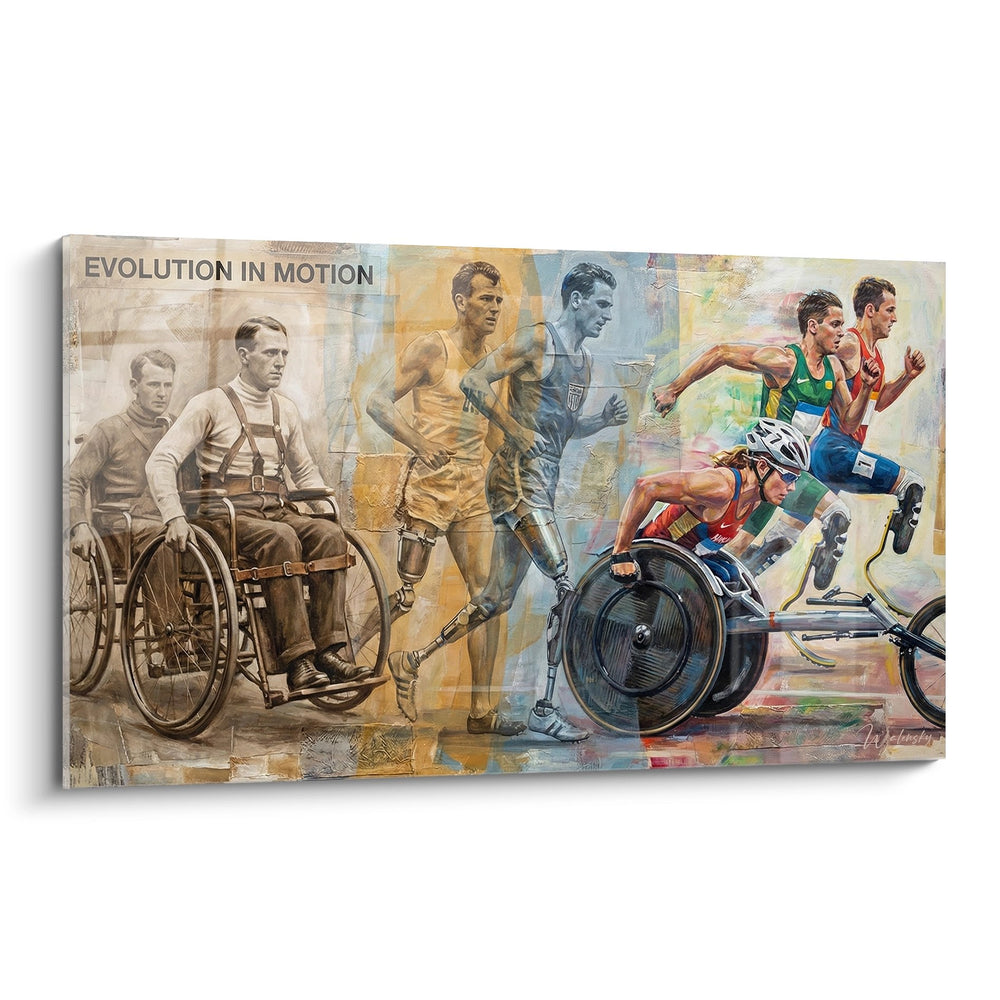 Ce tableau saisissant intitulé "Evolution in Motion" retrace l'extraordinaire parcours du mouvement paralympique à travers les décennies. L'œuvre présente une progression chronologique fascinante, débutant par les pionniers du sport adapté en fauteuil roulant dans les années 1940-50, représentés dans des tons sépia évoquant l'histoire. Au centre, l'évolution se poursuit avec les premières générations d'athlètes paralympiques, illustrées dans des teintes dorées et bleues symbolisant la détermination et l'excellence. La partie droite explose de couleurs vives, mettant en scène les champions paralympiques contemporains dans toute leur diversité : coureurs sur lames de carbone, cyclistes en fauteuil de course haute performance, athlètes handisport repoussant les limites du possible. Cette composition dynamique capture parfaitement l'esprit d'évolution constante du paralympisme, où chaque génération d'athlètes a contribué à transformer la perception du handicap et à redéfinir les standards de performance sportive. L'artiste a magistralement utilisé la technique du fondu enchaîné pour créer une continuité temporelle, symbolisant que cette évolution n'est pas terminée mais se poursuit encore aujourd'hui.