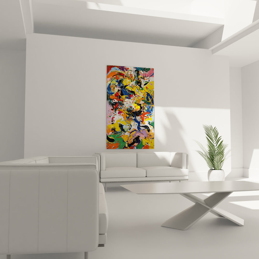 Cette œuvre d'art contemporaine présente une véritable explosion colorée abstrait qui captive instantanément le regard. Le tableau mural chaos créatif déploie un foisonnement de couleurs vibrantes où se mélangent harmonieusement jaunes éclatants, bleus profonds, oranges chaleureux, verts intenses et roses délicats. Les couleurs vives abstrait s'entremêlent dans un mouvement perpétuel, créant une composition dynamique qui évoque l'énergie pure de la création artistique. Les traces de pinceau visibles et les projections de peinture confèrent à cette peinture moderne colorée une texture riche et une profondeur remarquable. Cette œuvre d'art abstrait contemporain révèle de nouveaux détails à chaque observation, invitant le spectateur à une exploration visuelle infinie. Les superpositions de couleurs créent des zones d'ombre et de lumière qui donnent vie à la toile, tandis que les éclaboussures de peinture abstraite apportent une spontanéité caractéristique de l'art gestuel. Ce tableau décoratif moderne multicolore transforme instantanément l'atmosphère d'une pièce grâce à son énergie communicative et sa palette chromatique exceptionnelle.