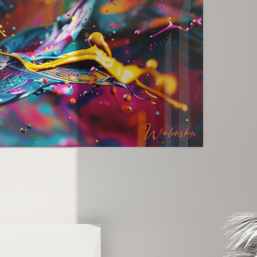 Ce tableau mural explosion colorée capture un moment de pure créativité où les couleurs se libèrent dans un ballet spectaculaire. L'œuvre présente une peinture abstraite contemporaine où les teintes turquoise, magenta, orange et dorées s'entremêlent dans un mouvement perpétuel. Au centre de la composition, une forme liquide semble exploser, projetant des gouttelettes colorées dans toutes les directions. Cette art mural moderne coloré évoque la spontanéité de l'action painting tout en conservant une harmonie visuelle remarquable. Les reflets métalliques et les nuances chromatiques créent une profondeur saisissante, transformant ce tableau abstrait explosion en véritable fenêtre vers l'émotion pure. La technique picturale simule parfaitement l'effet de liquides en mouvement, où chaque éclaboussure raconte une histoire différente. Cette œuvre d'art abstrait liquide s'inscrit dans la lignée des grands maîtres de l'abstraction gestuelle, offrant une interprétation contemporaine de la couleur en liberté. Le dynamisme de la composition invite le regard à voyager à travers les différentes strates colorées, révélant sans cesse de nouveaux détails et nuances chromatiques subtiles.