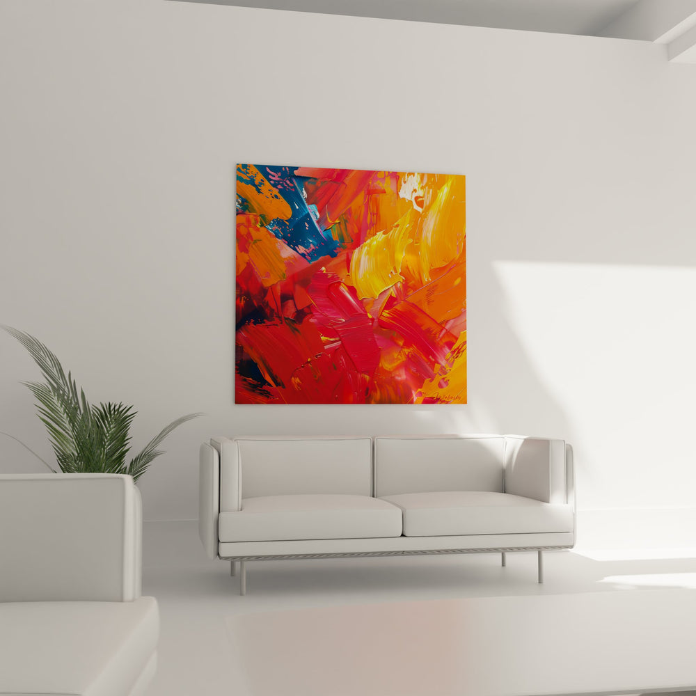 Ce tableau mural abstrait présente une composition dynamique dominée par une explosion de couleurs chaudes qui captive immédiatement le regard. L'œuvre se caractérise par des nuances rouge orange intenses qui s'entremêlent dans un ballet pictural saisissant. Les coups de pinceau expressifs créent une texture riche et vivante, où chaque trace de couleur semble portée par une énergie créatrice débordante. Cette peinture abstraite moderne révèle des zones de bleu profond qui contrastent harmonieusement avec les tons chauds dominants, apportant profondeur et équilibre à la composition. Les effets de matière picturale sont particulièrement remarquables, avec des empâtements qui accrochent la lumière et créent un relief tactile. L'artiste a su maîtriser les transitions chromatiques fluides entre les différentes zones colorées, générant un mouvement perpétuel qui anime toute la surface. Ce tableau abstrait contemporain évoque l'énergie du feu, la passion créatrice et la vitalité pure. Les formes organiques abstraites suggèrent des flammes dansantes, des coulées de lave ou des aurores boréales, laissant libre cours à l'imagination du spectateur. Cette œuvre s'inscrit parfaitement dans la tradition de l'art abstrait gestuel, où l'émotion prime sur la représentation figurative.