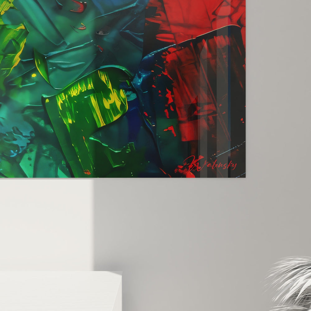 La palette chromatique de ce tableau décoratif explosion chromatique évoque un dialogue entre les éléments naturels : le rouge symbolise le feu et la passion, tandis que les verts rappellent la nature luxuriante et les bleus évoquent l'eau et la sérénité. Cette confrontation des couleurs primaires et secondaires crée une harmonie contrastée murale qui stimule l'émotion et dynamise l'espace. Les teintes saturées reflètent une énergie créatrice débordante, parfaite pour insuffler vitalité et caractère à une décoration contemporaine.