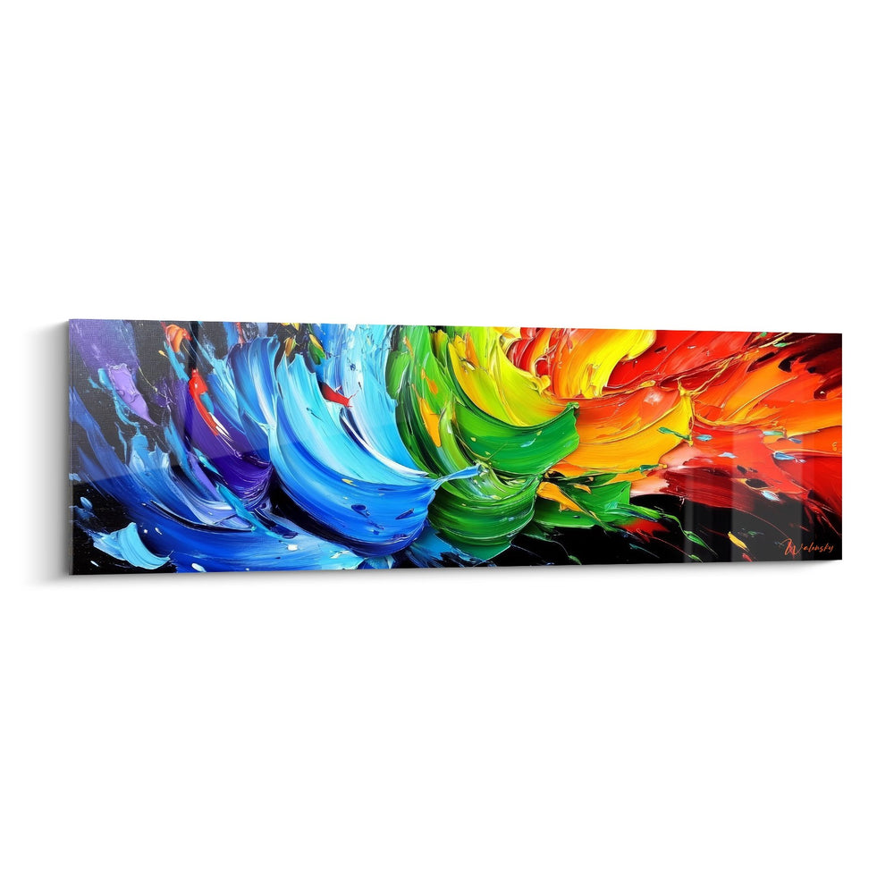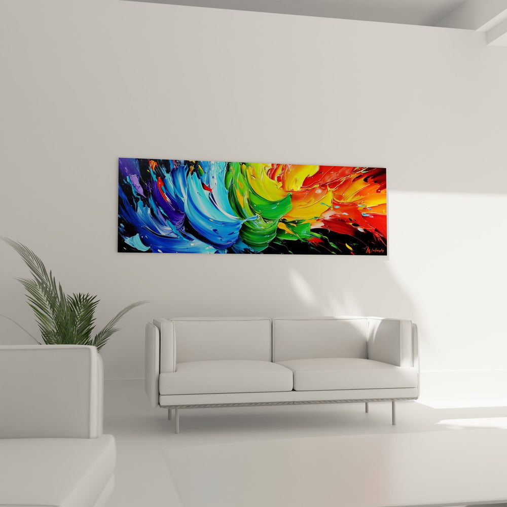 Ce tableau mural explosion de couleurs présente une composition dynamique où les teintes se mélangent dans un tourbillon spectaculaire. L'œuvre capture un mouvement centrifuge partant d'un noyau central sombre vers l'extérieur, créant une peinture abstraite moderne saisissante. Les bleus profonds et azurés dominent la partie gauche, évoluant progressivement vers des verts émeraude au centre, puis s'épanouissant en jaunes lumineux et oranges flamboyants pour culminer en rouges intenses sur la droite. Cette art mural contemporain utilise la technique de l'empâtement pour créer des reliefs et des textures qui accrochent la lumière. Les coups de pinceau énergiques et les projections de peinture témoignent d'une gestuelle libre et expressive, caractéristique du style abstrait expressionniste. L'artiste a magistralement orchestré cette symphonie chromatique murale en créant des zones de transition fluides entre chaque couleur, donnant l'impression d'une explosion colorée figée dans le temps. Cette décoration murale abstraite transforme instantanément l'atmosphère d'un espace par sa vitalité et son énergie créative, offrant une œuvre d'art contemporaine qui ne laisse personne indifférent.