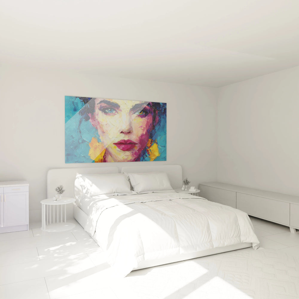 Les couleurs choisies dans ce tableau portrait moderne visage ne sont pas anodines et portent une symbolique forte. Le turquoise dominant évoque la sérénité et la profondeur spirituelle, créant un écrin apaisant pour le visage. Les jaunes lumineux symbolisent l'énergie vitale et l'optimisme, tandis que les roses et violets apportent une dimension de tendresse et de mystère. L'orange, couleur de la créativité et de l'enthousiasme, ponctue la composition de touches dynamiques. Cette harmonie chromatique reflète la complexité de l'émotion humaine, oscillant entre douceur et intensité. Le rouge des lèvres, couleur de la passion et de la vie, ancre le portrait dans une réalité charnelle et sensuelle typique des œuvres d'art contemporain portrait.