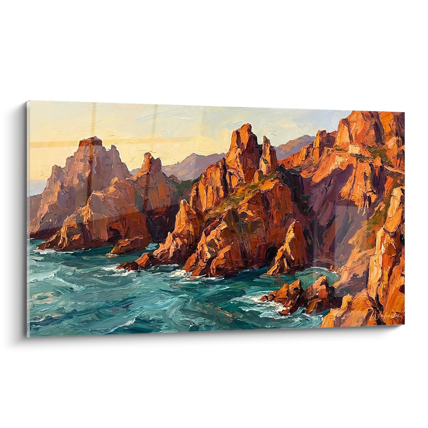 Ce tableau saisissant capture la beauté sauvage et dramatique des côtes corses au moment magique du coucher du soleil. L'œuvre représente des falaises majestueuses aux tons ocre et orangés qui s'élèvent fièrement au-dessus d'une mer turquoise aux reflets changeants. Les rochers sculptés par le temps et les éléments créent un paysage spectaculaire où la pierre semble littéralement embraser sous la lumière dorée du soleil couchant. Cette peinture aux couleurs chaudes évoque parfaitement l'atmosphère unique de la Méditerranée et la grandeur des paysages corses. Les jeux d'ombre et de lumière sur les parois rocheuses révèlent toute la complexité géologique de ces formations millénaires, tandis que les vagues viennent caresser la base des falaises dans un ballet éternel. L'artiste a su restituer avec brio la force brute de cette nature préservée, caractéristique du littoral corse. Cette œuvre murale apportera une touche d'évasion et de chaleur méditerranéenne à votre intérieur, rappelant les plus beaux couchers de soleil sur l'île de Beauté.