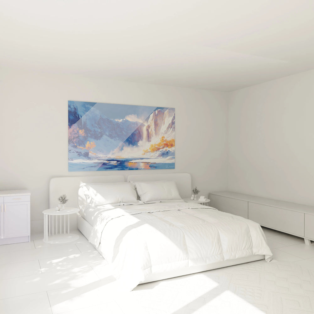 Ce qui distingue vraiment cette œuvre d'art mural cascade montagne, c'est l'intégration subtile de multiples sources lumineuses : la lumière directe du soleil levant, les reflets sur la neige et la glace, et la luminescence propre de la cascade créent un jeu complexe d'éclairages qui anime l'ensemble de la composition. Les détails minutieux, comme les branches individuelles des conifères se détachant contre le ciel ou les ondulations subtiles à la surface de l'eau, démontrent une observation patiente et une exécution méticuleuse qui rendent cette œuvre véritablement irremplaçable.