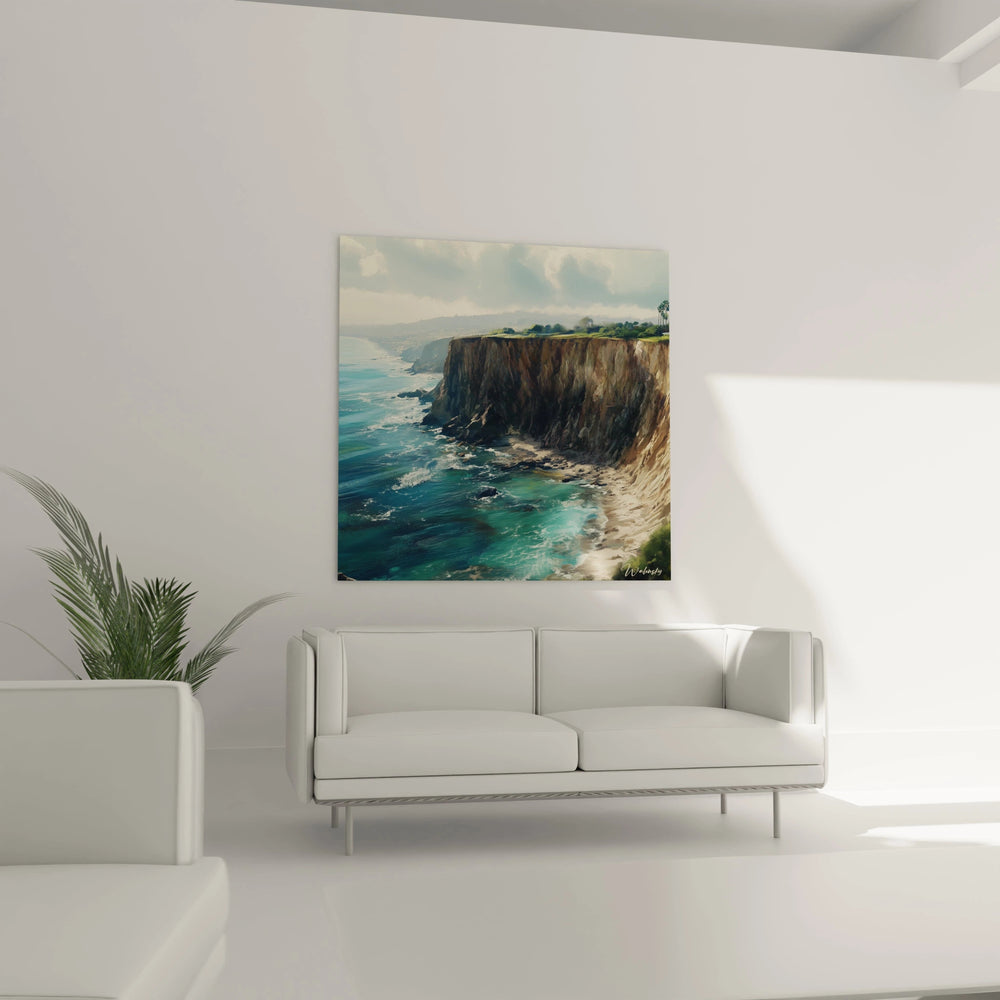 Cette œuvre saisissante présente un tableau plage côtière d'une beauté saisissante, où d'imposantes falaises rencontrent l'océan turquoise dans une composition dramatique. La première impression visuelle est celle d'un contraste puissant entre la verticalité des falaises brunes et l'horizontalité de l'eau bleue scintillante. Ce tableau plage aux falaises abruptes capture parfaitement l'instant où les vagues viennent caresser le sable doré au pied des immenses parois rocheuses.