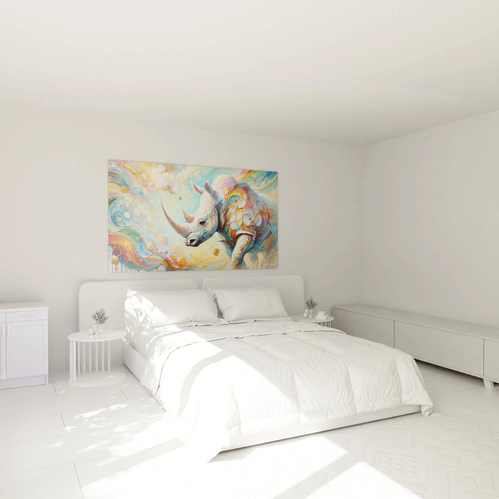 Imaginez les couleurs vibrantes â bleu profond, rose doux et Ă©clats dorĂ©s â dansant avec fluiditĂ© autour du rhinocĂ©ros, crĂ©ant un univers onirique oĂč la force et la beautĂ© sâentrelacent. Les formes rondes et les mouvements dĂ©licats qui entourent l'animal Ă©voquent le souffle de la vie, une Ă©nergie cosmique circulant Ă travers la toile, qui invite Ă un moment de contemplation et dâĂ©merveillement.