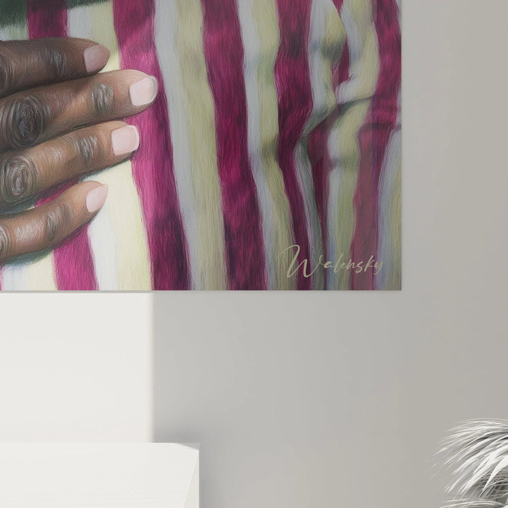 Les rayures de la chemise introduisent des notes vives - rouge bordeaux, vert olive et jaune paille - qui dynamisent la composition sans compromettre l'harmonie d'ensemble. Cette art mural faon coloré démontre une maîtrise parfaite des transitions chromatiques douces.