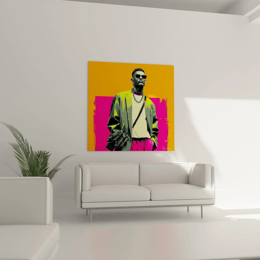 Cette œuvre d'art murale représente un portrait urbain saisissant qui capture l'essence de la mode urbaine contemporaine à travers une esthétique pop art raffinée. Le personnage central, un homme à la prestance naturelle, incarne parfaitement l'élégance streetwear moderne avec ses lunettes de soleil emblématiques et sa gestuelle décontractée. Son style vestimentaire sophistiqué mélange harmonieusement une veste oversized aux nuances olive et jaune néon, superposée à un t-shirt crème intemporel. Le pantalon rose vif apporte une touche audacieuse qui dynamise l'ensemble, tandis que le sac bandoulière noir et la chaîne métallique complètent cette tenue avec une élégance urbaine assumée. L'arrière-plan vibrant, composé d'un dégradé orange saturé et d'éléments graphiques magenta aux contours déchirés, crée un contraste visuel puissant qui amplifie la présence du sujet. Cette composition artistique s'inspire des codes visuels du pop art des années 80-90, revisités avec une sensibilité contemporaine qui célèbre la culture hip-hop et l'esthétique street fashion moderne. Le traitement vectoriel aux lignes nettes et aux couleurs franches confère à l'œuvre une dimension graphique moderne, parfaite pour sublimer tout espace de vie urbain. Cette création artistique transforme un simple portrait en véritable manifeste visuel de la mode masculine contemporaine.