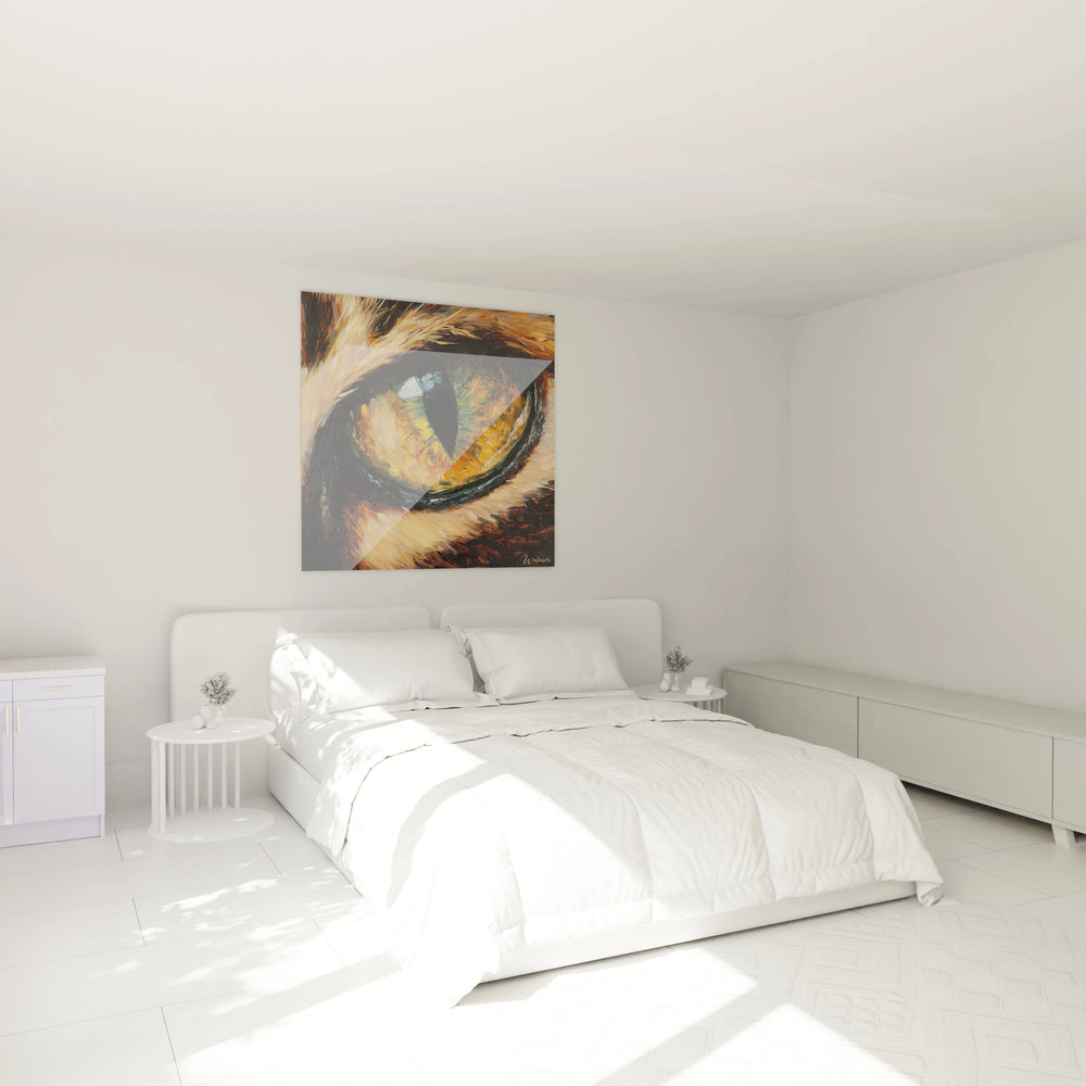 Cette art mural œil félin utilise des contrastes chauds-froids subtils avec quelques touches de verts émeraude dans l'iris, créant une vibration colorée captivante qui évoque la puissance et le mystère félin.