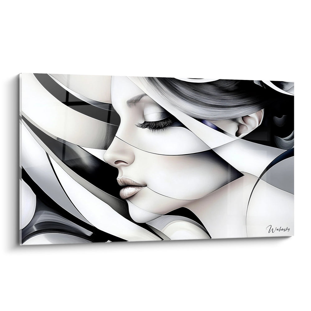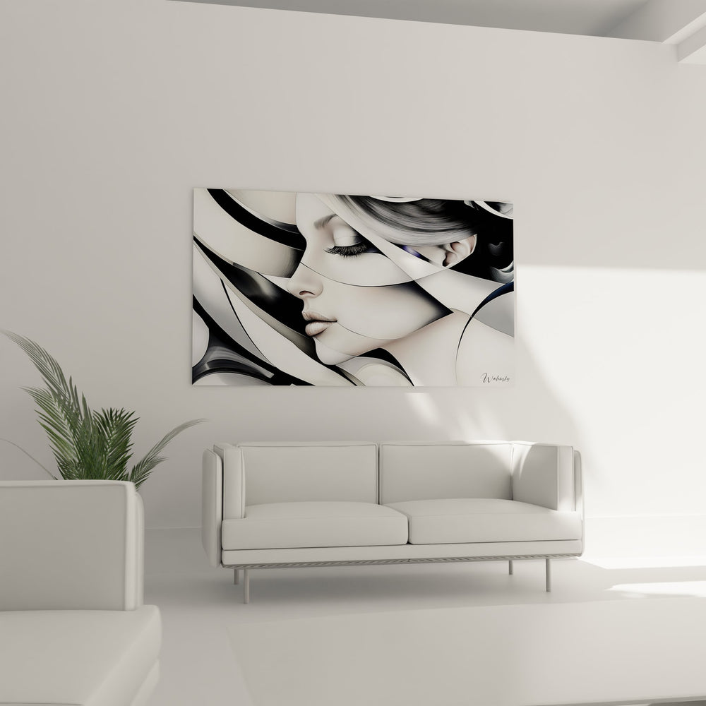 Tags : tableau femme abstraite, art moderne visage, décoration murale contemporaine, portrait géométrique, œuvre noir et blanc