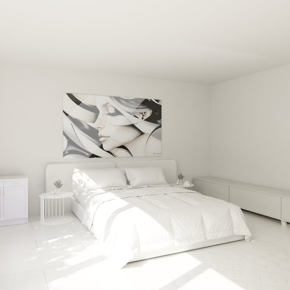 Ce tableau femme abstraite présente une œuvre d'art contemporaine saisissante qui capture l'essence de la beauté féminine à travers une approche géométrique moderne. Le portrait abstrait femme révèle un visage délicat fragmenté par des courbes fluides et des lignes architecturales qui créent un jeu visuel fascinant. Les formes géométriques abstraites s'entremêlent harmonieusement autour du profil féminin, créant une composition dynamique où chaque élément contribue à l'équilibre général de l'œuvre. Ce tableau mural visage se distingue par sa technique de fragmentation qui décompose et recompose les traits du visage selon une esthétique résolument contemporaine. L'artiste a magistralement utilisé les courbes organiques abstraites pour créer un dialogue entre la douceur des traits féminins et la rigueur des lignes géométriques. Cette œuvre d'art moderne femme transforme le portrait traditionnel en une vision futuriste où la beauté transcende les limites de la représentation classique. Le tableau décoratif abstrait s'impose comme une pièce maîtresse capable de sublimer tout espace de vie grâce à son caractère à la fois épuré et sophistiqué, incarnant parfaitement l'esprit de l'art contemporain.
