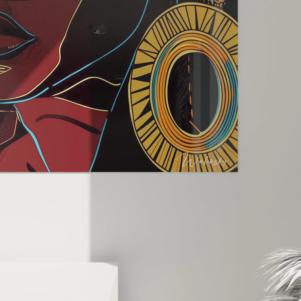 Cette art mural femme utilise des contrastes calculés entre couleurs chaudes et froides pour créer une profondeur visuelle saisissante. Les nuances de rouge et d'orange évoquent la chaleur et la passion, tandis que les touches de bleu apportent une fraîcheur contrastante. L'harmonie chromatique reflète l'esthétique africaine contemporaine, où chaque couleur porte une signification symbolique forte.