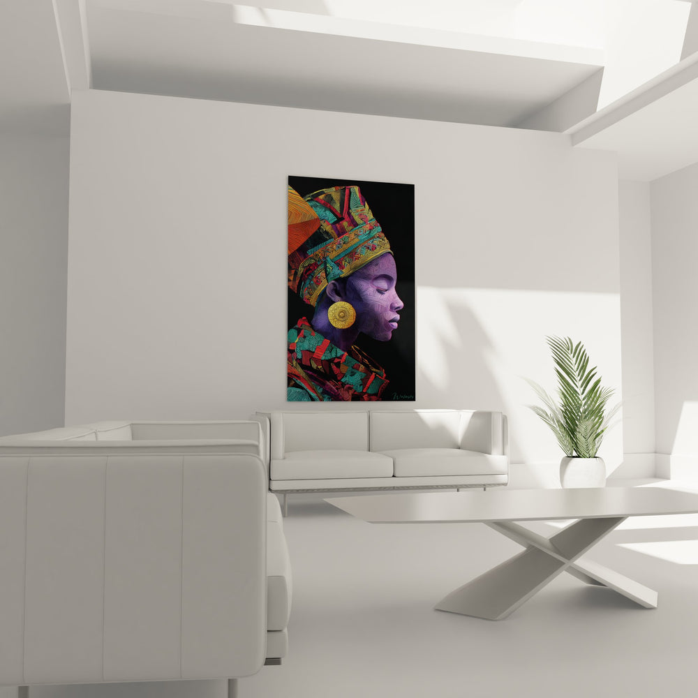 Ce tableau mural femme africaine présente un portrait saisissant d'une femme de profil aux traits délicatement sculptés dans des tons violets profonds. Son visage africain stylisé est orné de motifs géométriques finement ciselés qui évoquent les scarifications traditionnelles. La coiffe africaine traditionnelle qui couronne sa tête est un véritable festival de couleurs : rouge écarlate, turquoise éclatant, jaune doré et orange vibrant s'entremêlent dans des motifs tribaux africains complexes. Cette œuvre d'art africain moderne capture l'essence de la beauté féminine africaine tout en intégrant des éléments contemporains. Les boucles d'oreilles dorées circulaires ajoutent une touche d'élégance à ce portrait tribal féminin, tandis que les vêtements colorés aux motifs géométriques complètent harmonieusement la composition. Cette décoration murale africaine transforme instantanément l'atmosphère d'une pièce, apportant chaleur, caractère et sophistication. L'artiste a su marier tradition et modernité dans cette représentation de la femme africaine contemporaine, créant une pièce unique qui célèbre la richesse culturelle du continent africain.