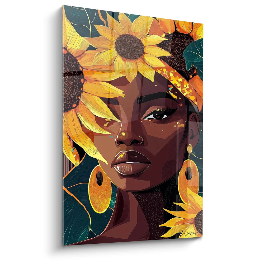 Ce tableau femme aux tournesols présente un portrait saisissant où se mêlent harmonieusement beauté humaine et splendeur florale. L'œuvre révèle immédiatement sa force visuelle à travers le contraste entre les tons chauds dorés des tournesols et les nuances profondes de la peau. Cette décoration murale femme africaine capture l'essence d'une féminité rayonnante, sublimée par un environnement floral luxuriant. Les boucles d'oreilles dorées créent un lien visuel parfait avec les cœurs bruns des tournesols, établissant une cohérence chromatique remarquable. L'expression sereine du visage contraste avec l'énergie vibrante des fleurs environnantes, créant une tension visuelle captivante.
