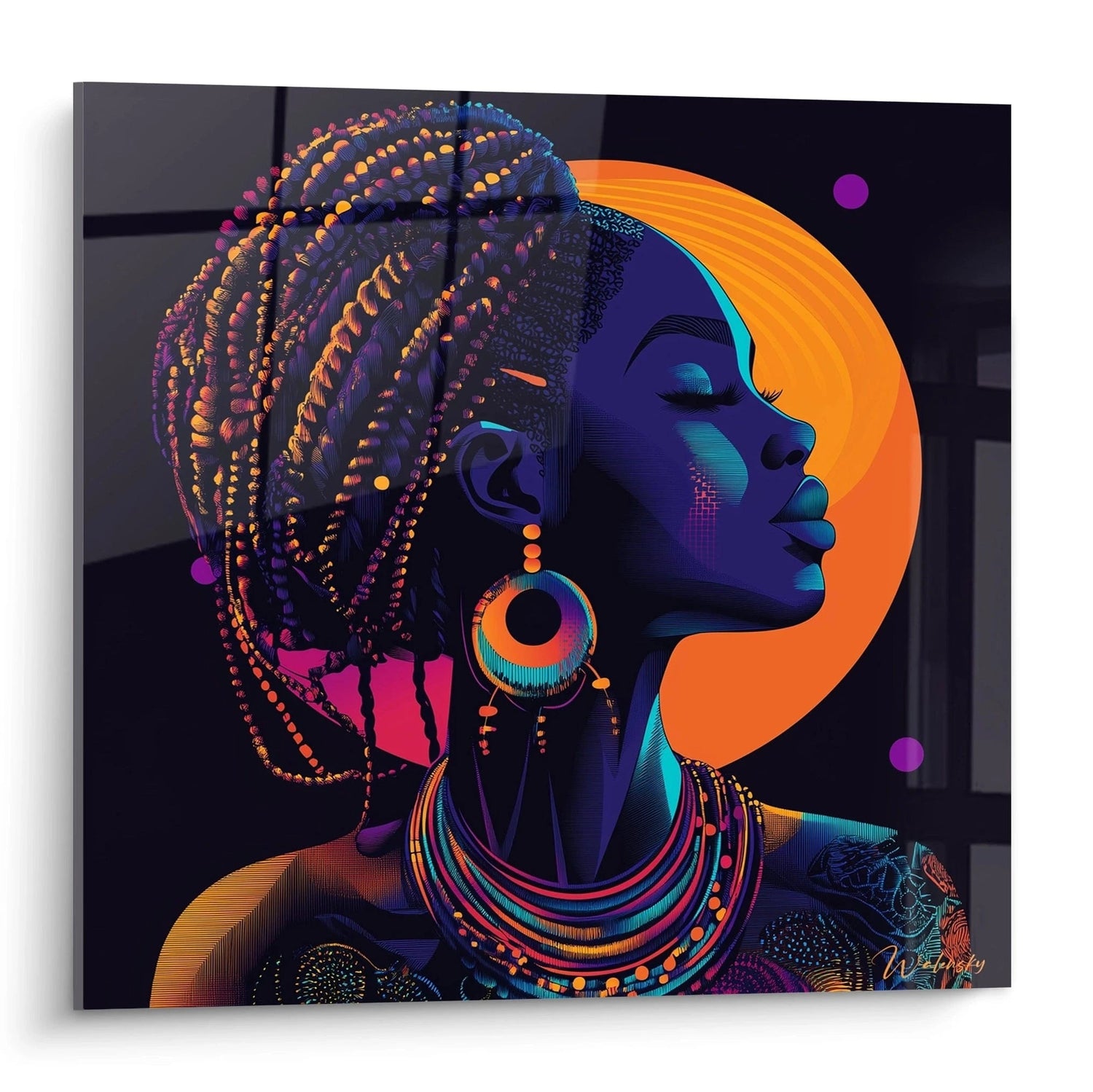 Cette décoration murale femme africaine exploite brillamment les contrastes complémentaires orange-bleu pour créer une tension visuelle dynamique. Les nuances saturées évoquent la richesse des textiles africains traditionnels tout en apportant une modernité saisissante à l'ensemble.