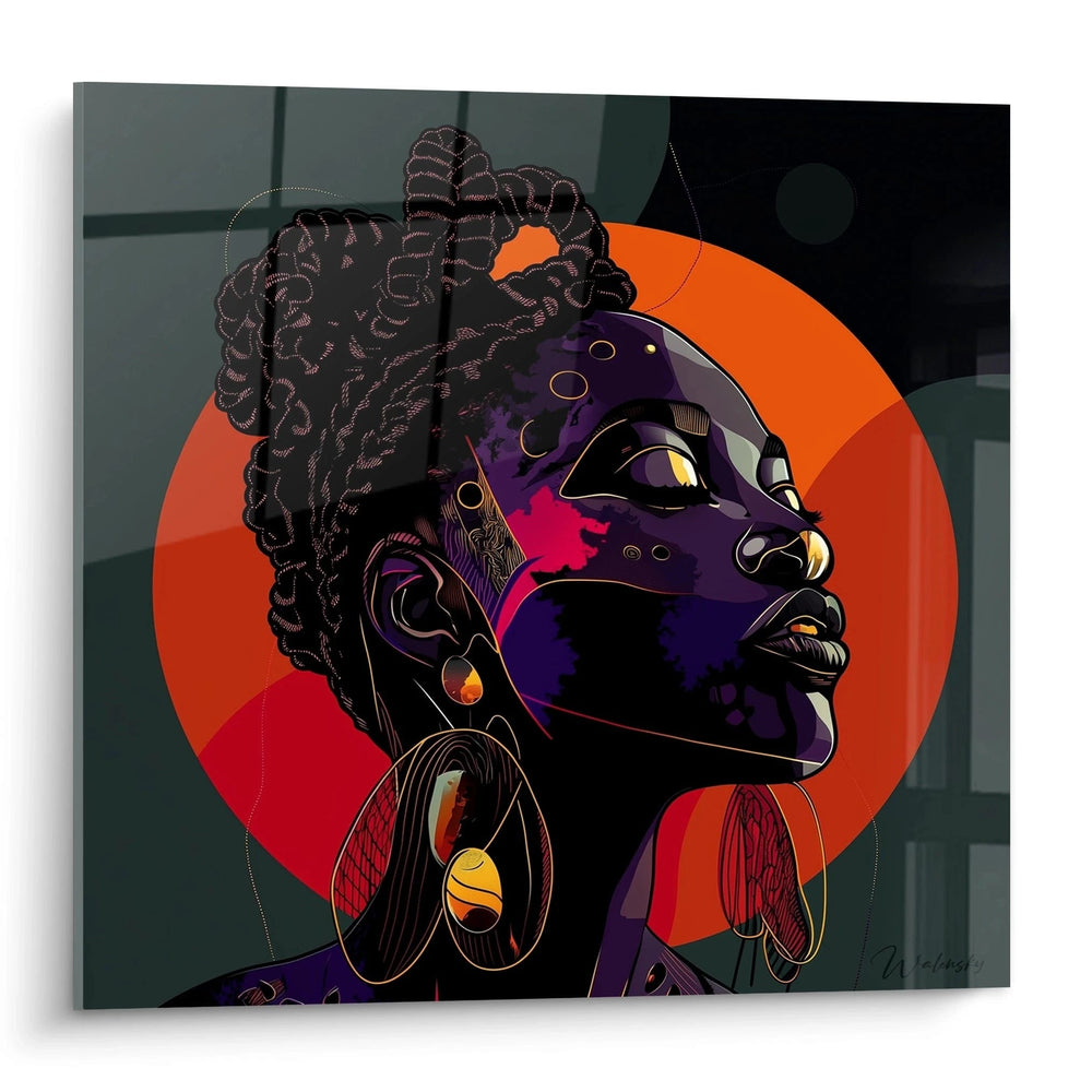 Ce tableau femme africaine révèle un portrait saisissant d'une femme au profil noble, baignée dans une atmosphère orangée et pourpre. L'œuvre capture l'essence de la beauté africaine contemporaine à travers un style graphique moderne et sophistiqué. Le tableau femme africaine profil élégant présente une composition équilibrée où la silhouette se détache majestueusement contre un fond géométrique vibrant. Les cheveux tressés en couronne, les bijoux dorés et les tons chauds créent une harmonie visuelle remarquable. Cette décoration murale femme africaine évoque à la fois modernité et tradition dans un équilibre parfait.