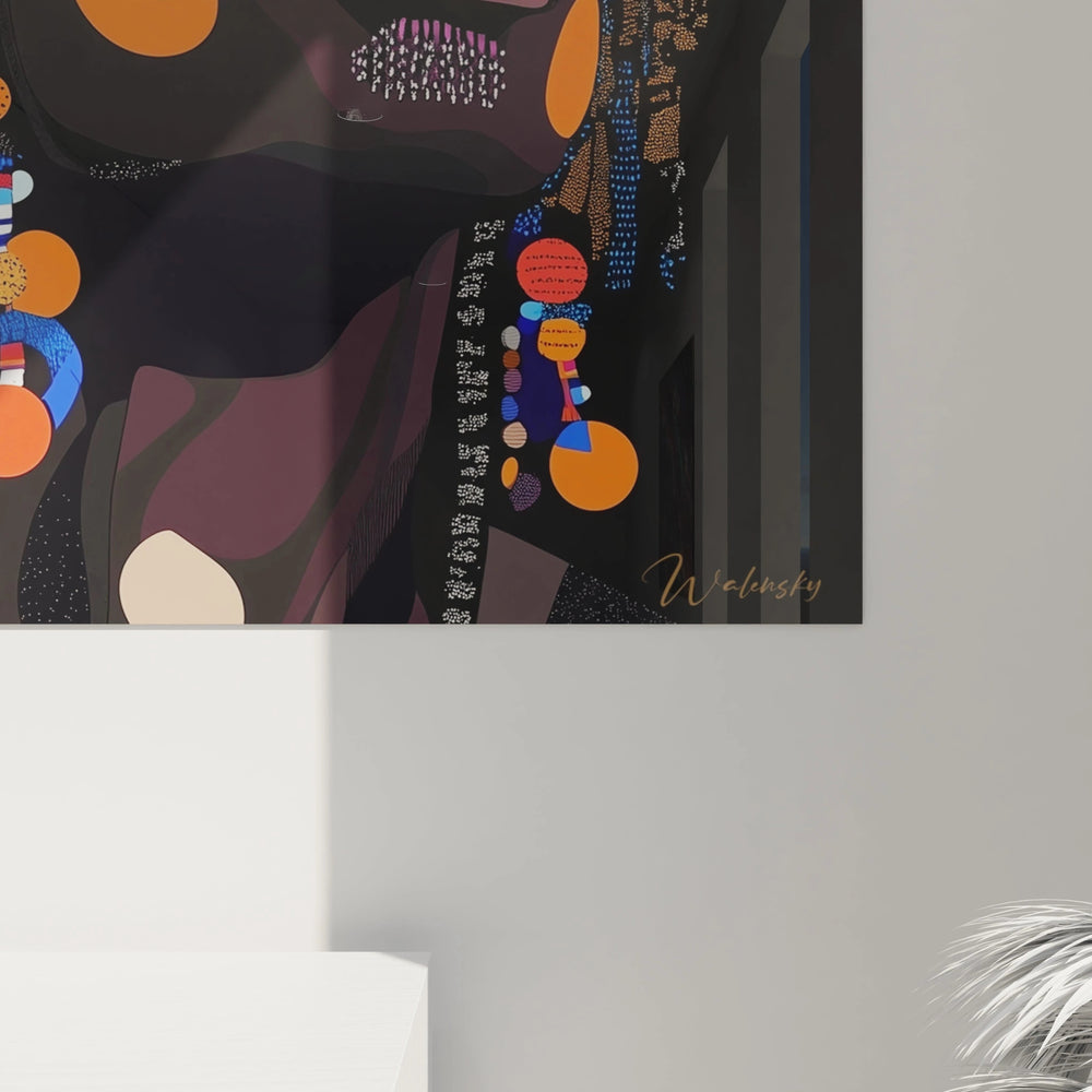L'examen des textures révèle la complexité technique de ce tableau femme technique mixte. Les surfaces présentent une alternance fascinante entre zones lisses et texturées, créant un relief visuel captivant. Les effets de lumière sont particulièrement réussis au niveau du modelé du visage, où les ombres et les éclats se succèdent avec naturalisme. La technique artistique identifiable mélange apparemment techniques numériques et références à l'art traditionnel, créant un style hybride unique. Les détails des motifs décoratifs révèlent une précision remarquable, chaque élément étant soigneusement intégré dans l'ensemble. Cette œuvre femme contemporaine démontre une maîtrise technique accomplie, where chaque texture contribue à l'impact global de l'œuvre. La densité des informations visuelles reste parfaitement contrôlée, évitant la surcharge tout en maintenant la richesse.