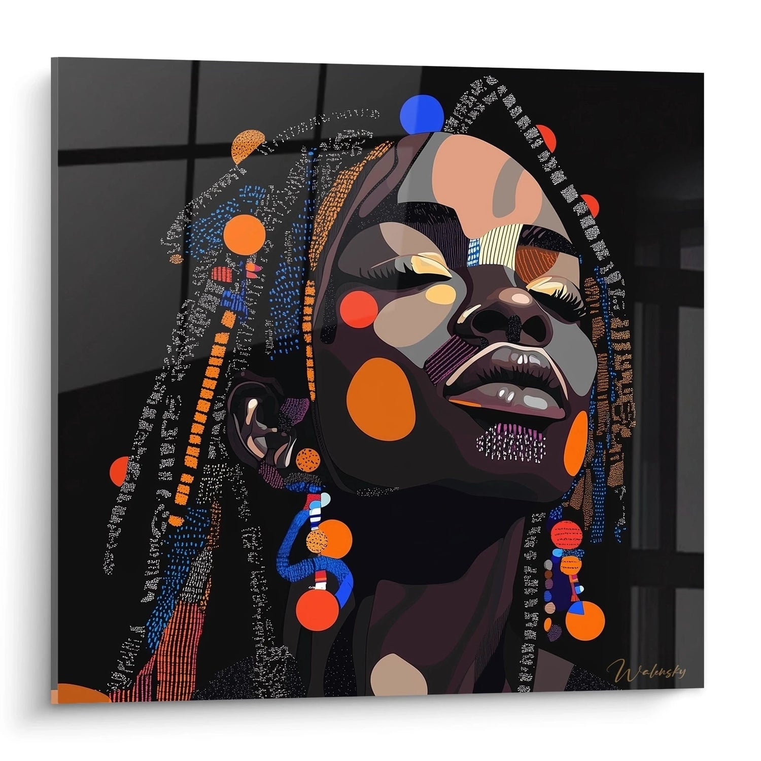Ce tableau femme contemporain frappe immédiatement par sa composition audacieuse et sa richesse chromatique exceptionnelle. L'œuvre présente un portrait stylisé d'une femme africaine, traité dans un style graphique moderne qui mélange réalisme et abstraction géométrique. Les éléments décoratifs qui encadrent le visage créent une auréole artistique complexe, transformant ce tableau femme africaine contemporaine en une véritable célébration visuelle. Les formes circulaires colorées ponctuent la composition avec une rythmique particulière, while des motifs textuels semblent danser autour du sujet principal. Cette décoration murale femme moderne capture l'essence de l'art contemporain africain avec une approche résolument urbaine et sophistiquée.