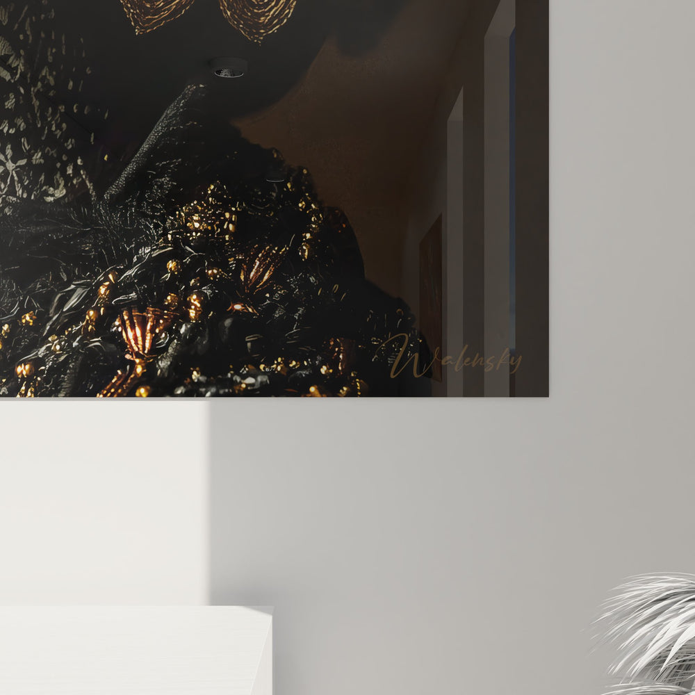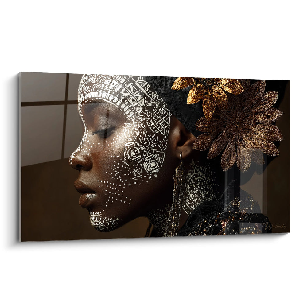 Ce magnifique tableau mural femme africaine capture l'essence de la beauté traditionnelle à travers un portrait saisissant orné de motifs tribaux dorés. L'œuvre présente le profil gracieux d'une femme africaine, sa peau sublimée par des ornements géométriques blancs et dorés qui dessinent des patterns complexes sur son visage et son corps. Ces décorations corporelles africaines évoquent les traditions ancestrales de body painting pratiquées dans diverses cultures du continent africain. L'art tribal contemporain s'exprime ici à travers un headwrap élaboré aux motifs géométriques blanc et noir, complété par un imposant bijou floral doré qui orne sa coiffure. La composition artistique met en valeur la noblesse du sujet grâce à un éclairage dramatique qui fait ressortir les contrastes entre les zones d'ombre et de lumière. Cette décoration murale africaine s'inscrit dans la lignée de l'art afro-contemporain, mêlant tradition et modernité. Les peintures faciales traditionnelles représentées avec des points blancs et des lignes géométriques rappellent les rituels sacrés et les cérémonies initiatiques. L'artiste a su créer une œuvre où chaque détail contribue à l'harmonie générale, faisant de ce tableau portrait africain une pièce maîtresse pour toute décoration intérieure moderne.